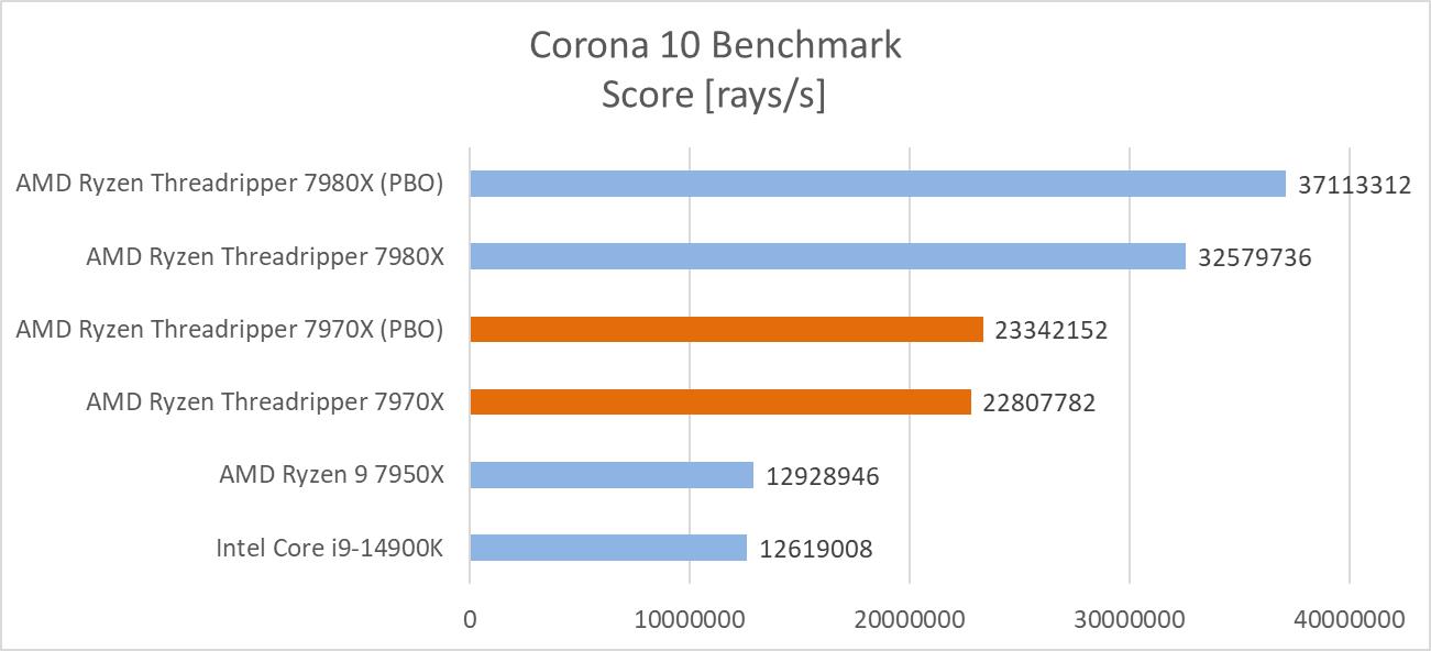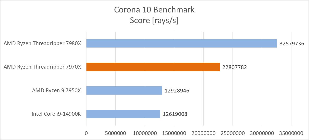Silnik renderujący Corona dostępny jest Autodesk 3ds Max oraz Cinema 4D. Co ważne, nie wspiera on GPU, więc wydajność CPU jest tutaj kluczowa. W testach skorzystałem z benchmarka przygotowanego przez twórców, który dobrze sprawdza się w praktyce.