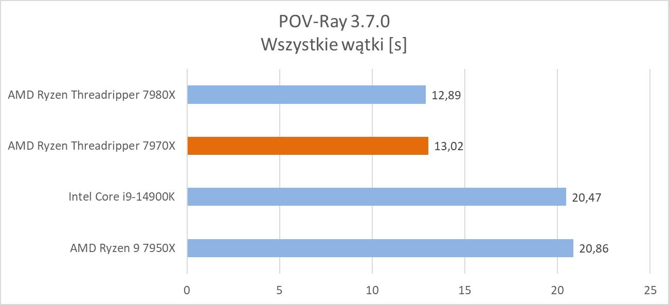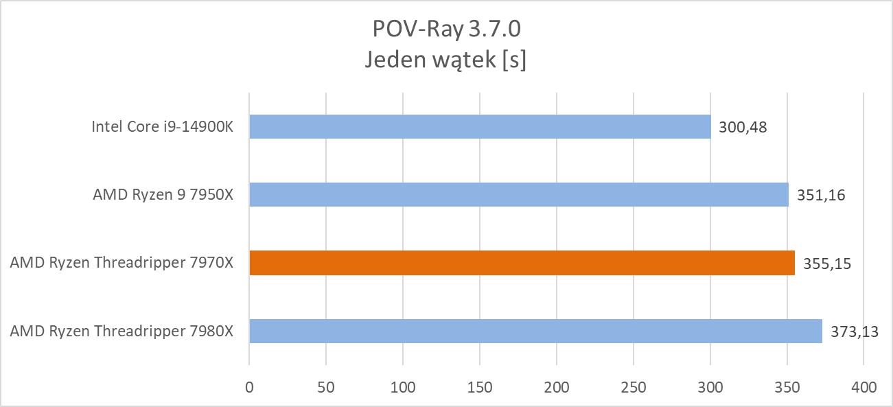POV-Ray to kolejny program mający wbudowany benchmark. Tym razem pozwala on na tworzenie obrazów z wykorzystaniem ray tracingu i służy głównie do tworzenia grafiki 3D. W testach wykorzystałem benchmark jedno i wielowątkowy.