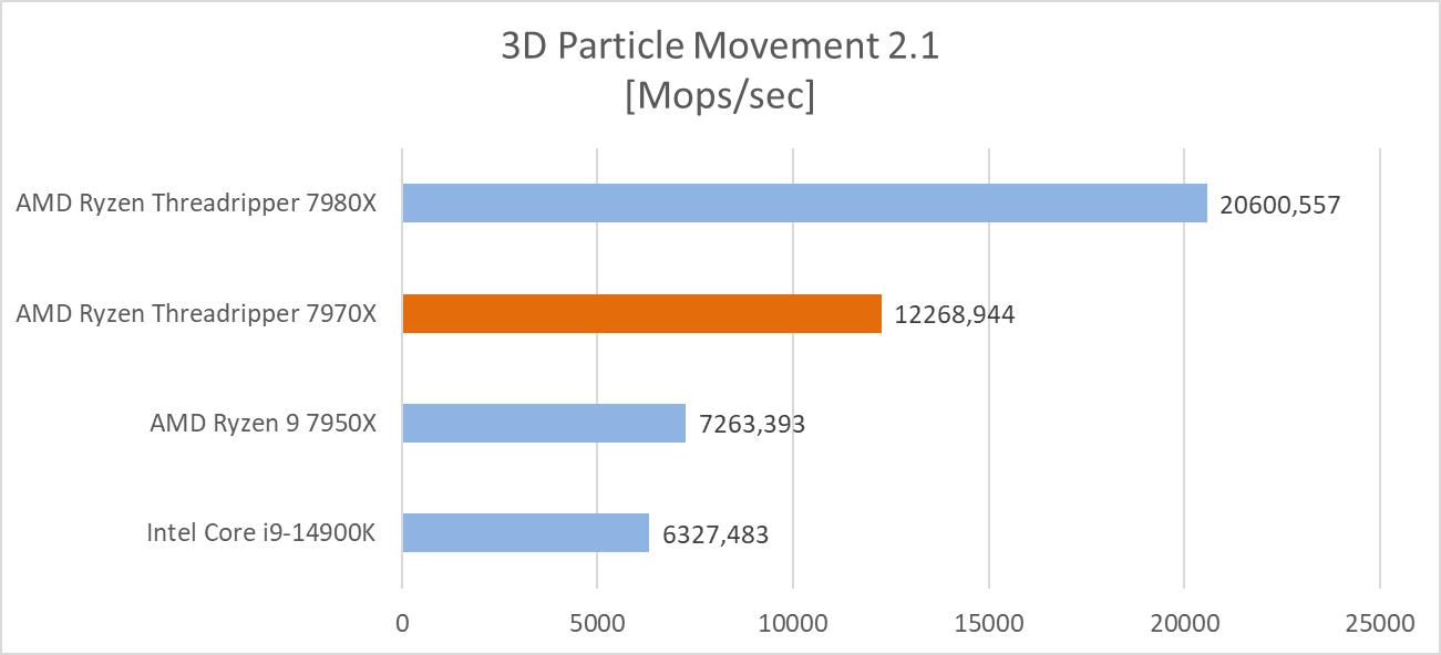 3DPM został opracowany przez serwis Anandtech. Symuluje on sześć różnych rodzajów ruchów cząstek w trójwymiarze. Poniżej znajdziecie ogólny wyniki testu podany jako mops/sec.