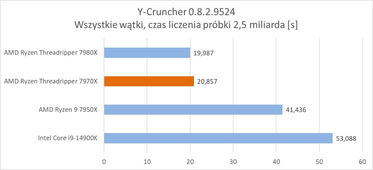 Y-Cruncher to benchmark pozwalający na zmierzenie wydajności liczenia liczby Pi przy wykorzystaniu wszystkich wątków procesora. Pozwala to dobrze na porównanie wielowątkowej wydajności różnych konstrukcji. Tutaj wykorzystałem próbkę 2,5 miliarda.