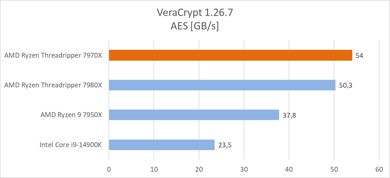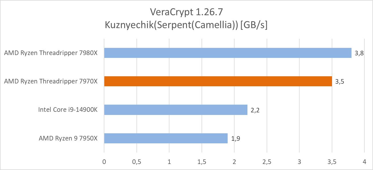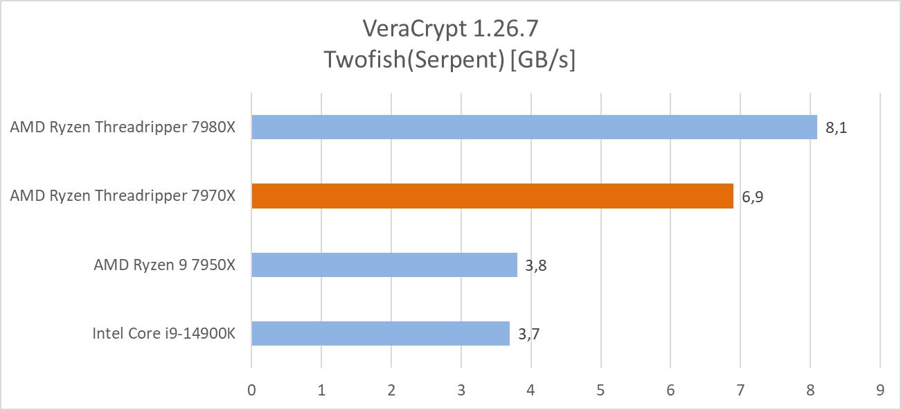 VeraCrypt to oficjalny następca TruCrypt. Jest to oprogramowanie open-source więc nie ma co się dziwić, że jest naprawdę popularny. Program ma wbudowany benchmark, który wykorzystałem w sprawdzeniu wydajności procesorów. Na wykresach poniżej znajdziecie średnie wyniki trzech testów: AES, Twofish(Serpent) oraz Kuznyechik(Serpent(Camellia)).