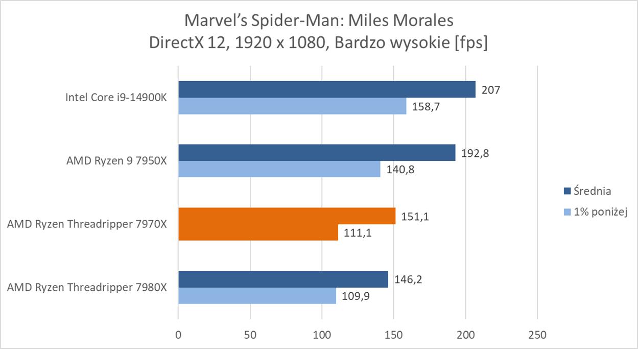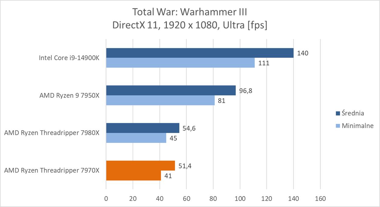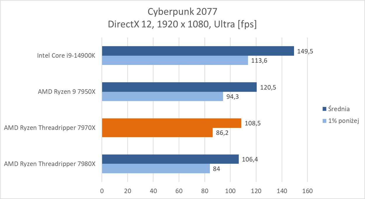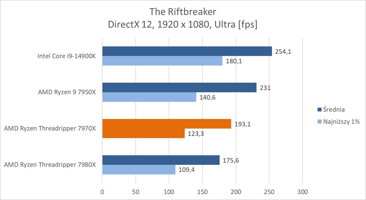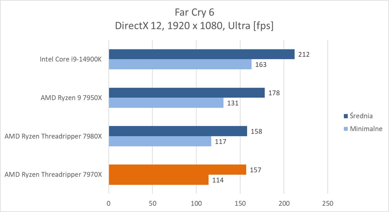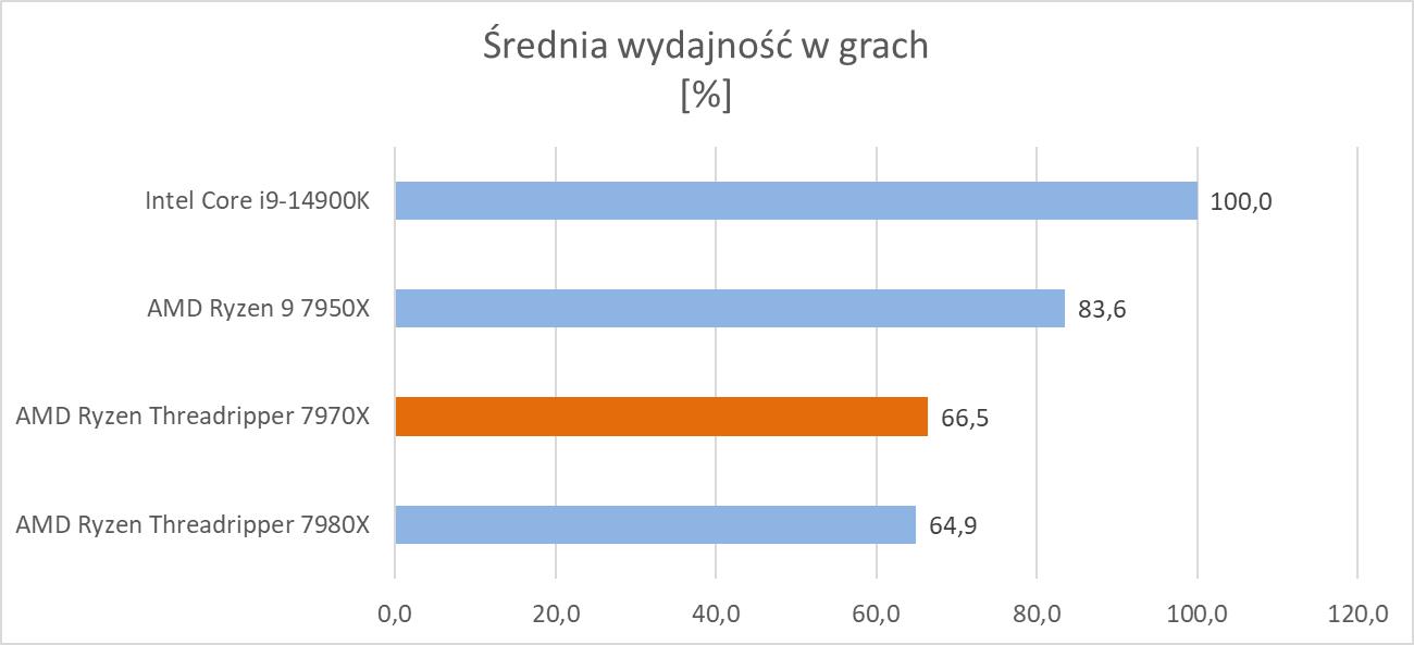 Wydajnośc w grach wrzucam jako ciekawostkę. 7970X wypada trochę lepiej od 7980X, ale do pozostałych CPU sporo mu brakuje. Oczywiście możecie spokojnie grać w gry, ale nie ma co liczyć na wysoką wydajność. Tutaj dodam tylko, że w BIOSie czy w Ryzen Master powinna być dostępna opcja Game Mode, która może poprawić wyniki w niektórych tytułach.