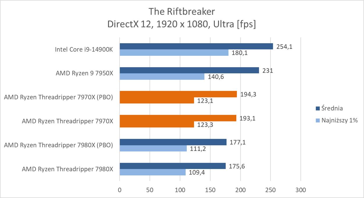 Procesory AMD domyślnie testowane były przy wyłączonej opcji PBO. Testy z PBO również znajdziecie w dalszej części artykułu. Procesory Intela testowane były przy ustawieniu zalecanym przez firmę, czyli PL1=PL2=MTP. Procesory Threadripper sparowałem z pamięciami G.Skill Zeta R5 Neo 4x 32 GB 6400 MHz CL32 po włączeniu EXPO. Jednostki AMD Ryzen i Intel Core były testowane z pamięciami Kingston Fury Renegade RGB 2x 16 GB 6400 MHz CL32 po włączeniu XMP. Konstrukcje AMD pracowały w trybie synchronicznym, a Intel przy Gear 2. Wszelkie technologie typu Asus MCE zostały wyłączone – mogą one wpływać na wydajność procesora. Testy powtarzałem 3 razy lub do uzyskania powtarzalności. Procedurę w każdej grze lub programie znajdziecie w opisie pod odpowiednimi nagłówkami.
