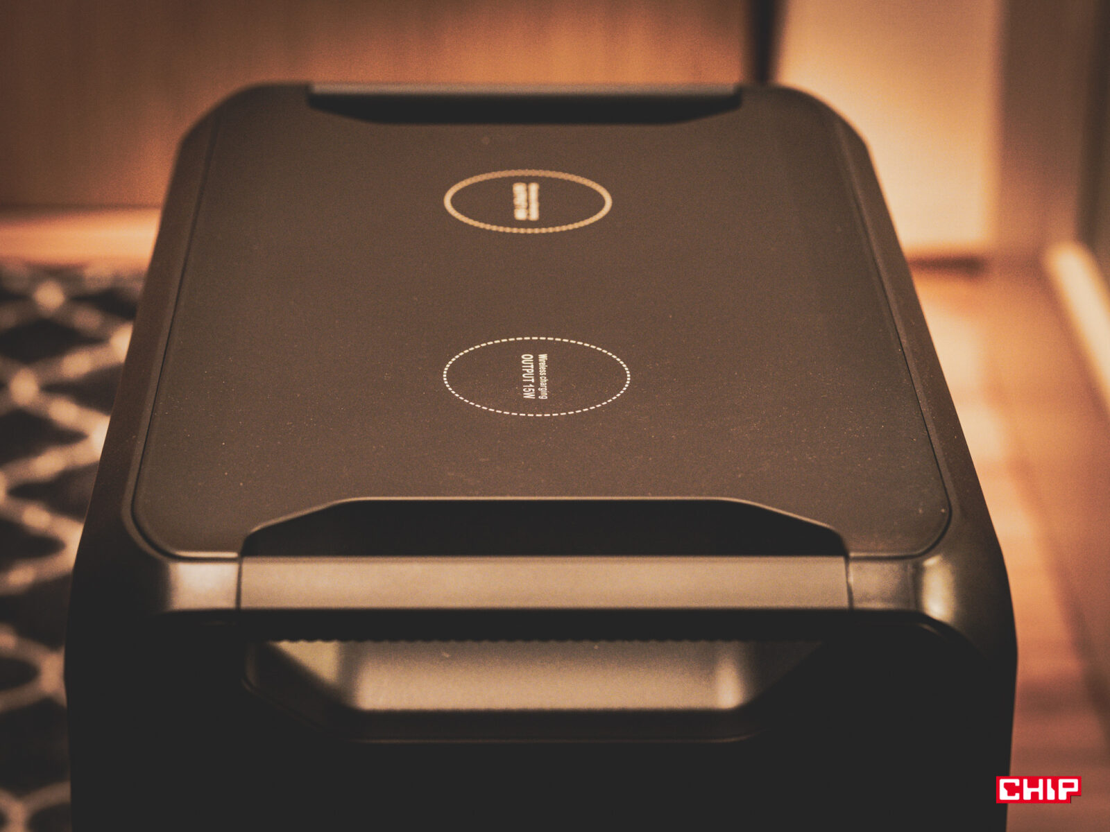 Zacznijmy od tego, co widać gołym okiem – Bluetti AC500 oraz Bluetti B300S pasują do siebie idealnie. Obudowa stacji zasilania AC500 o wymiarach 52 x 32,5 x 35,8cm doskonale dopasowuje się do bazy jaką stanowi B300S (modularność FTW!). Bez większego kłopotu możemy w ten sposób zbudować stabilną wieżę, która nie będzie zajmować zbyt dużo cennego miejsca, wieńcząc całą konstrukcję centrum sterowania w postaci AC500. A dlaczego nie na odwrót? Chociażby ze względu na fakt, że na górze stacji zasilania mamy dwa wyraźne okrągłe pola do bezprzewodowego ładowania (każde o mocy 15W). Szkoda byłoby stracić taką możliwość, prawda?