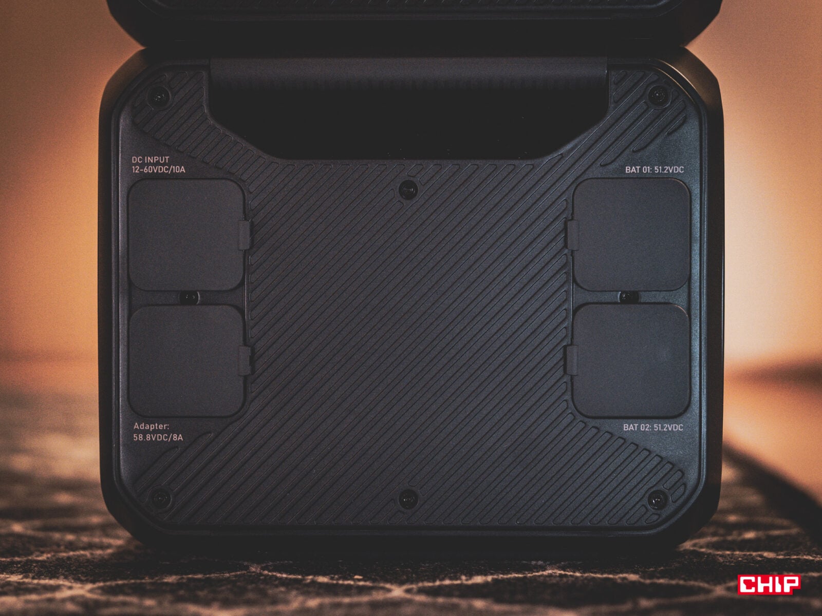 Poszczególne moduły spinamy ze sobą solidnym grubym kablem, który przychodzi w zestawie z każdą baterią B300S. Wymaga on zabezpieczenia obu końcówek specjalnym zatrzaskiem (dopiero wtedy rozpocznie się faktyczny przesył energii). Gniazd oznaczonych jako BAT 01 i BAT 02 na szczęście nie sposób pomylić z innymi portami na boku, których akurat w przypadku AC500 jest dość sporo. Bliżej przedniej krawędzi znajdziemy port do ładowania całej konstrukcji z gniazdka elektrycznego (AC Input). Poniżej znajduje się też port umożliwiający podłączenie stacji zasilania bezpośrednio do paneli fotowoltaicznych (stosowny kabel ze złączem MC4 znajdziemy w zestawie z AC500, podobnie jak standardowy kabel zasilający oraz drugi kabel z końcówką MC4, tym razem przeznaczony do gniazda zapalniczki samochodowej).