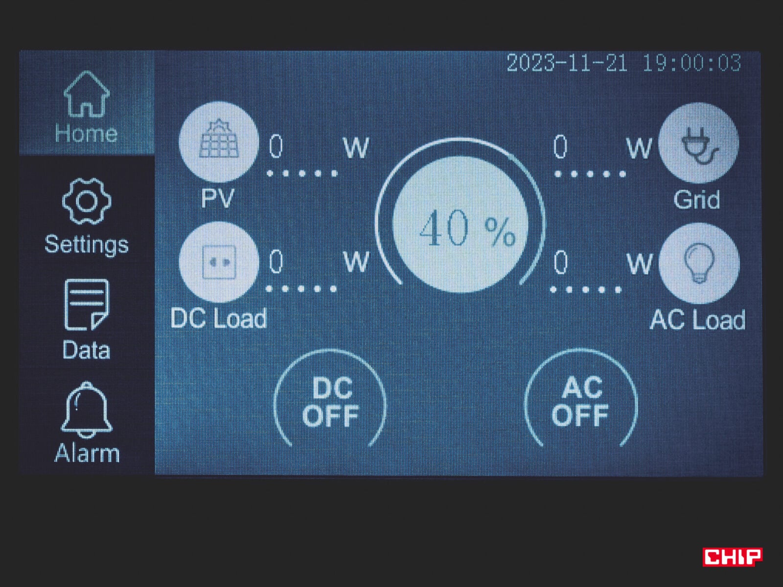 Po spięciu ze sobą obu modułów pora włączyć całą maszynerię (wystarczy jeden z przycisków, bo moduły komunikują się ze sobą) i rzucić okiem na wybudzony wyświetlacz, który na szczęście jest również dotykowy. Widać na nim oczywiście poziom naładowania baterii, jak również potencjalną konsumpcję energii z podłączonych do systemu urządzeń (AC Load i DC Load wyrażoną w watach), podobnie jak ilość energii pobieranej z różnych źródeł (PV – fotowoltaika, Grid – sieć elektryczna). W razie kłopotów jednym dotknięciem na ekranie możemy wyłączyć wszystkie złącza dla prądu zmiennego (AC Off) oraz stałego (DC Off).