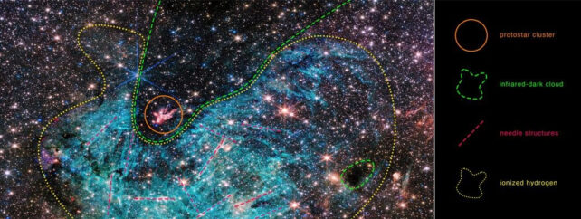 Jeśli uda się tego dokonać, to kolejnym z pytań, na które uzyskamy odpowiedź, będzie to, czy w sercu naszej galaktyki powstaje więcej masywnych gwiazd aniżeli na krawędziach jej ramion spiralnych. W obserwowanym regionie znajduje się też ogromna protogwiazda o masie ponad 30-krotnie większej od Słońca.