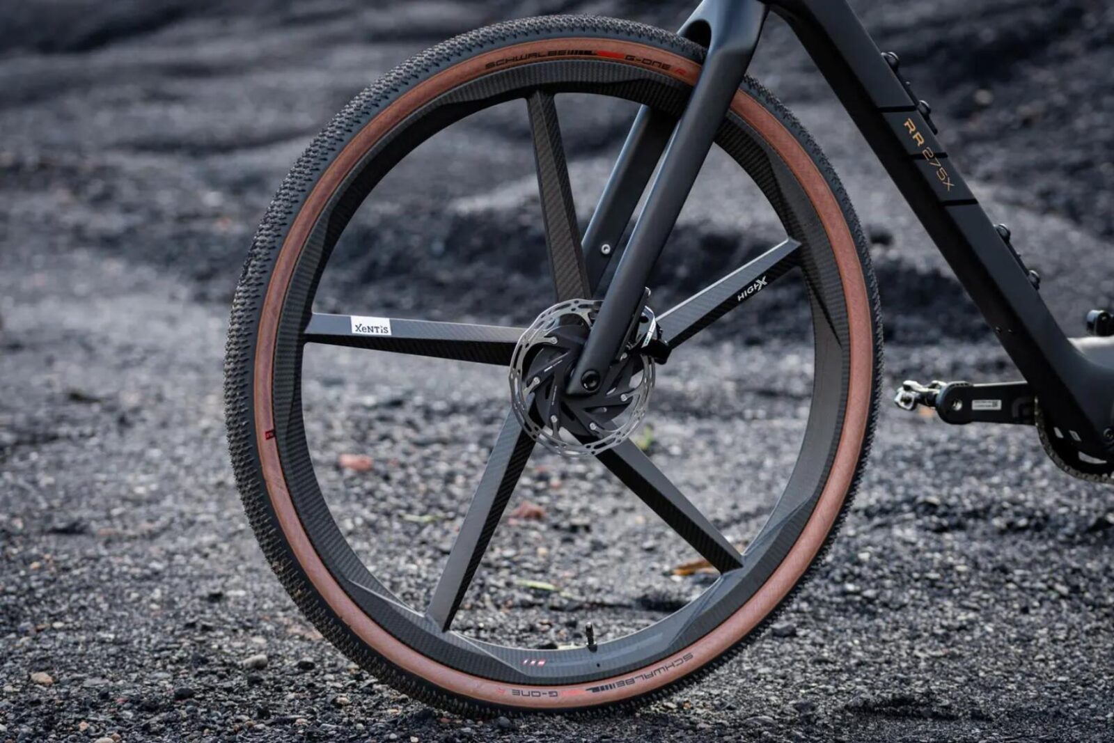 Ledwie rzut oka na elektryczny rower R.R27X w najdroższej wersji Ultra wystarcza, aby ocenić, że nie jest to byle e-bike, a coś z najwyższej półki. Uwagę od razu przyciągają same 28-calowe, pięcioramienne obręcze roweru, które to zostały wykonane z monolitycznego włókna węglowego przez austriacką firmę Xentis i są zoptymalizowane pod kątem lekkości, sztywności i aerodynamicznej wydajności. Obręcze są pokryte ochronną powłoką UV i wyposażone w odporne na przebicie opony Schwalbe G-One R Evo, a ich design współgra z równie zaawansowaną ramą o wyścigowym charakterze i wykonaną oczywiście również z włókna węglowego.