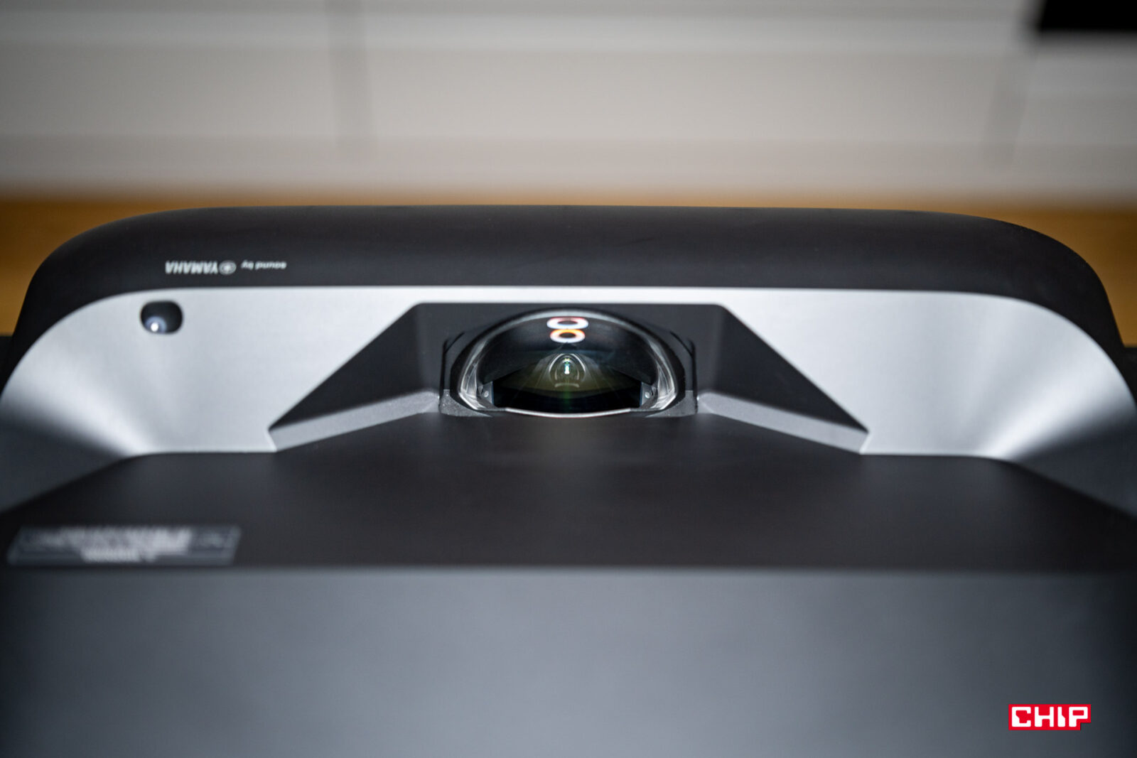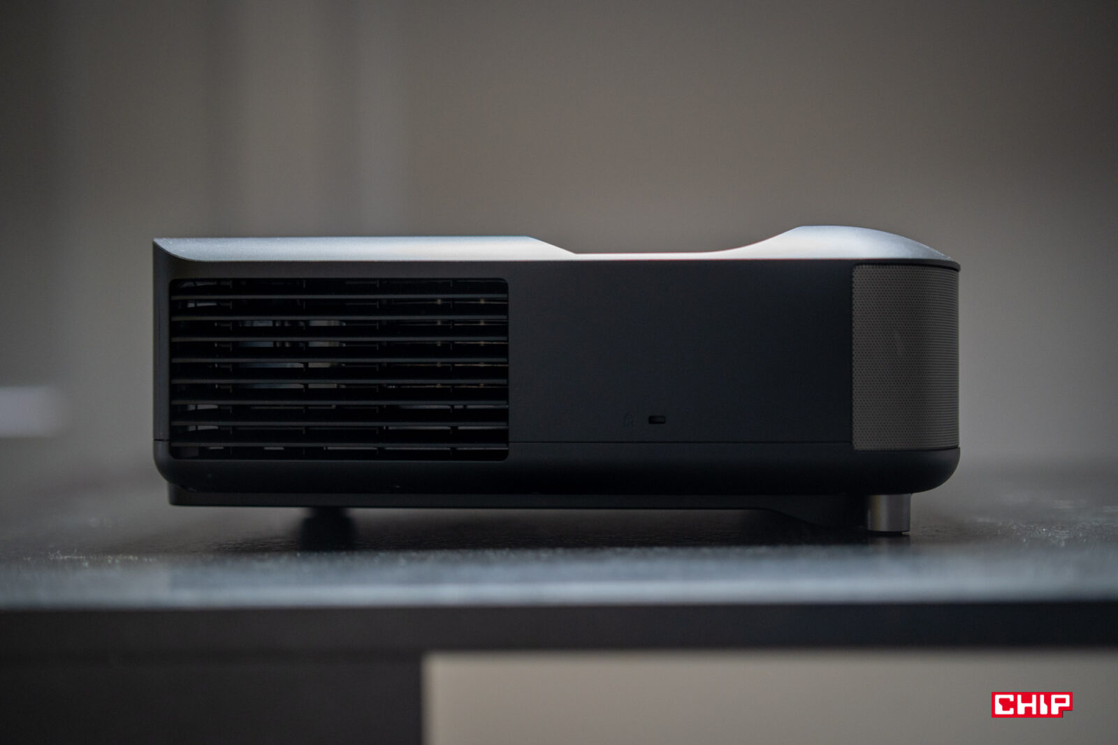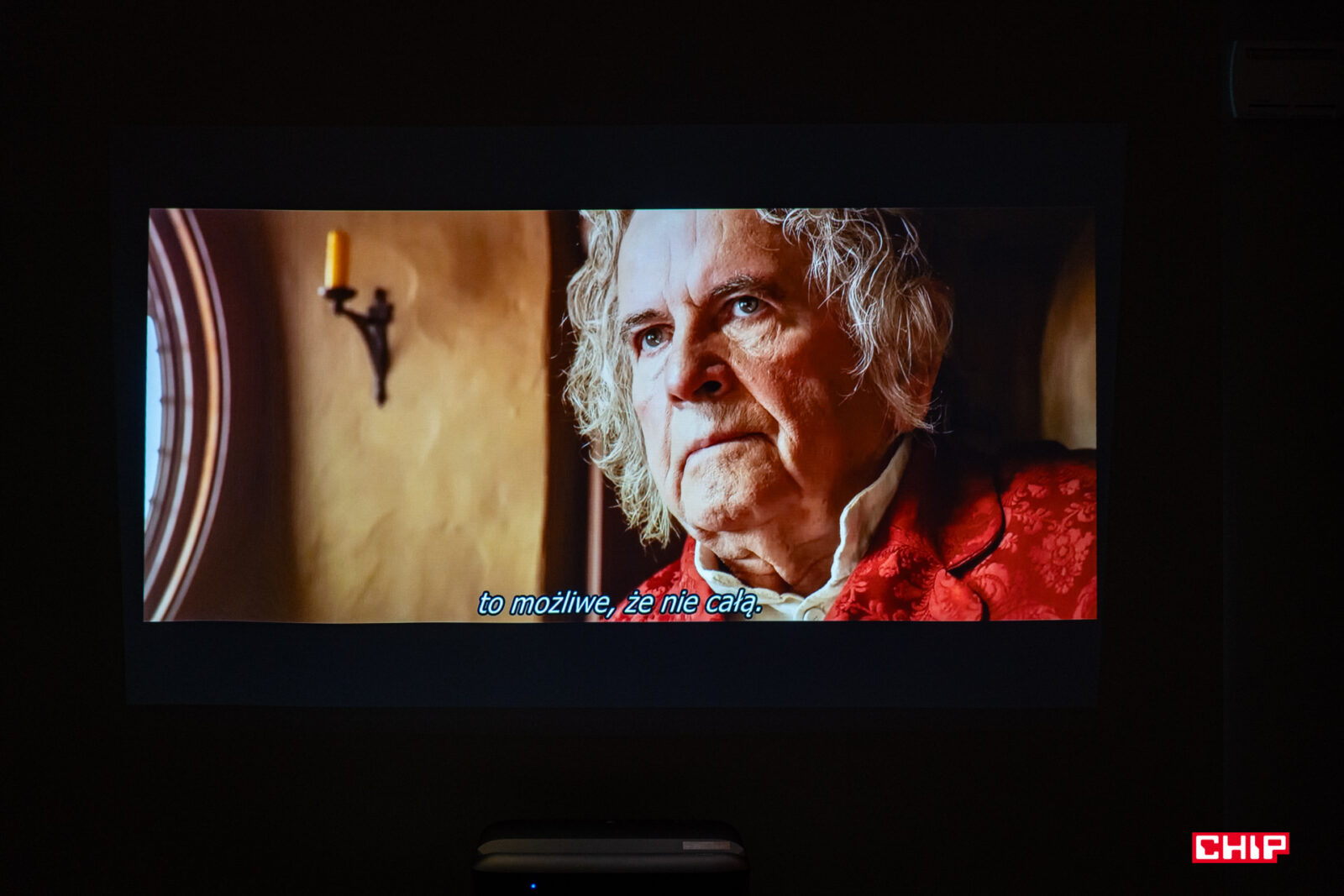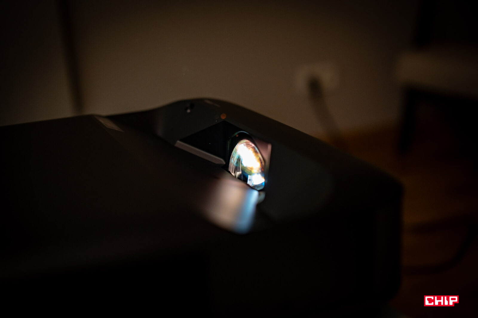 W dużym uproszczeniu, w środku takiego projektora obraz przechodzi przez szereg soczewek i jest przy okazji powiększany. Strumień światła wychodzi z projektora pod dużym kątem, przez otwór w górnej części obudowy, więc dystans do powierzchni projekcyjnej jest ekstremalnie krótki. Wystarczy wspomnieć, że już na dystansie rzędu 3-4 cm od ściany testowany model jest w stanie wyświetlić obraz o przekątnej sięgającej 60″. Możemy więc swobodnie postawić urządzenie na niskiej szafce pod ścianą, którą do tej pory zajmował telewizor o podobnej przekątnej. Jestem ogromnym fanem tego typu rozwiązań, bo zbliżają one doświadczenie z punktu widzenia typowego użytkownika do tego, z czym stykamy się podczas obsługi typowego odbiornika TV.