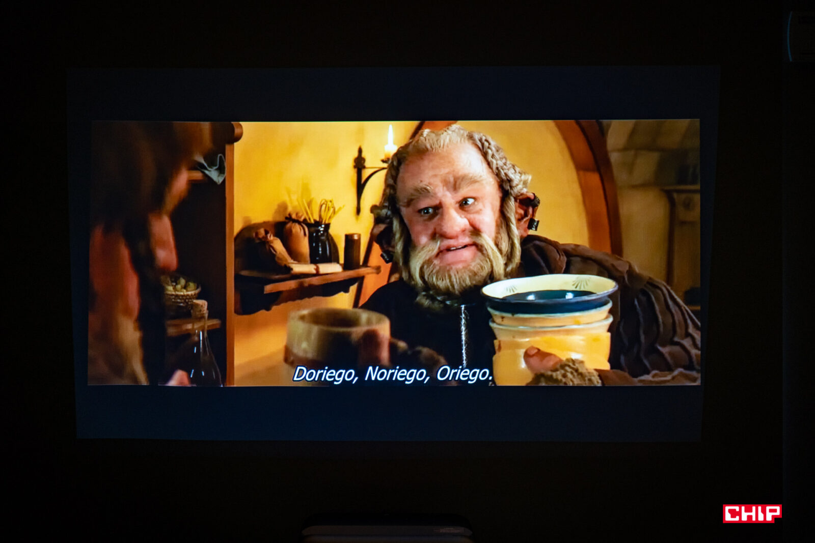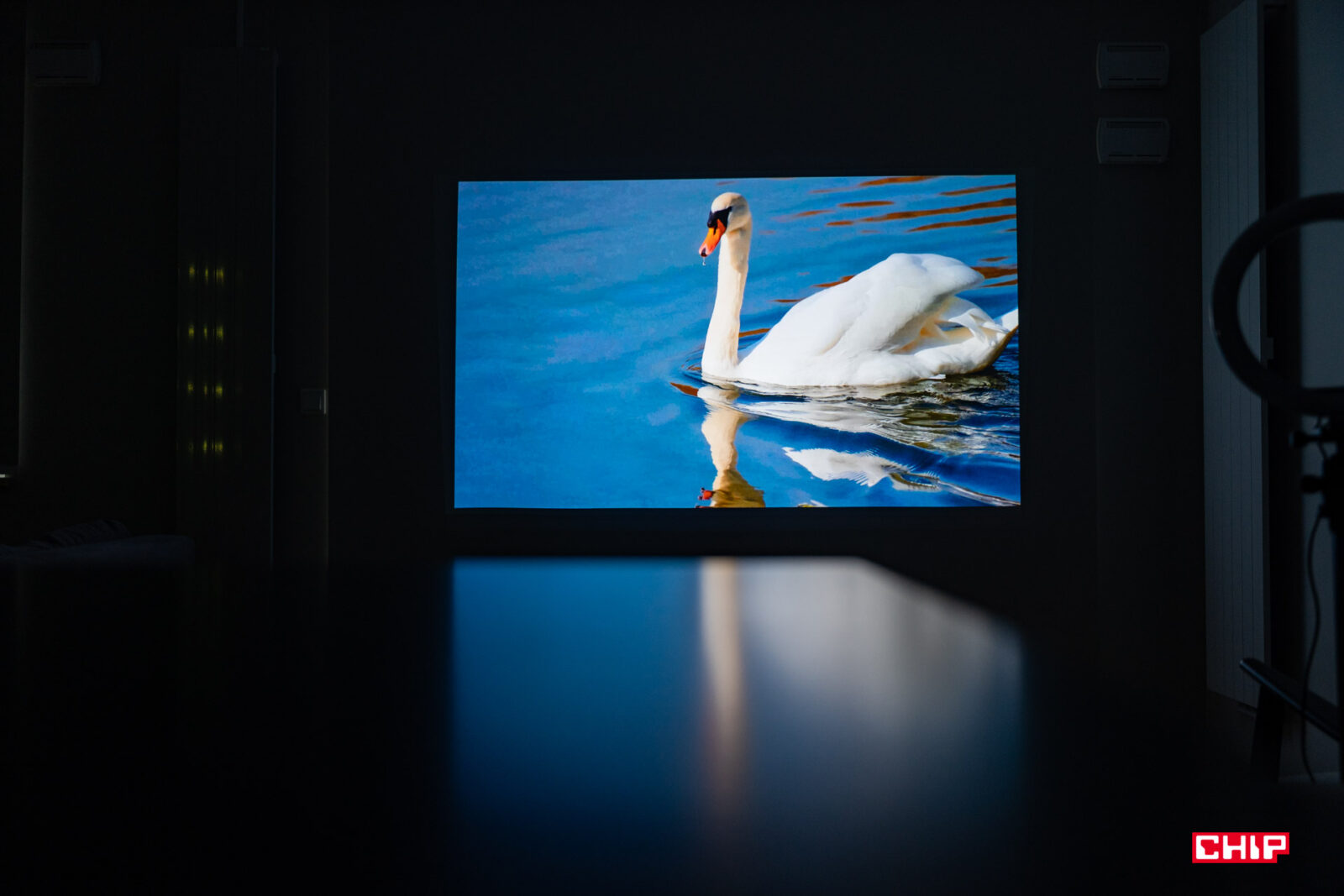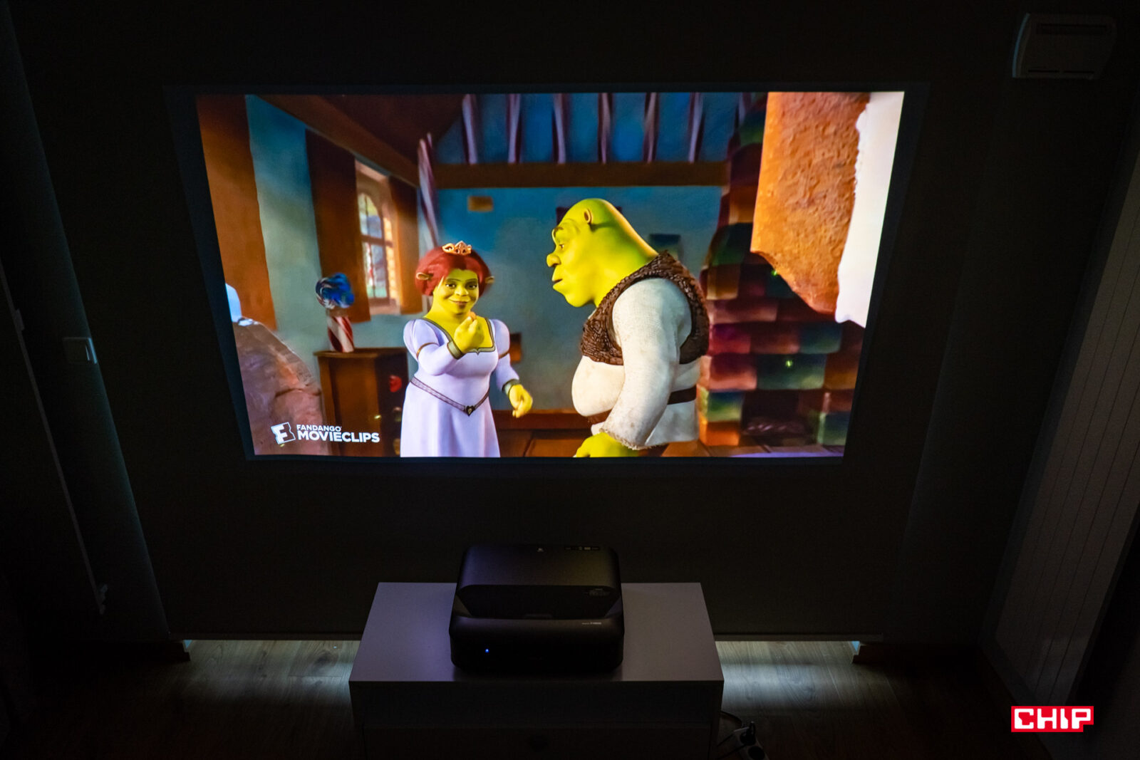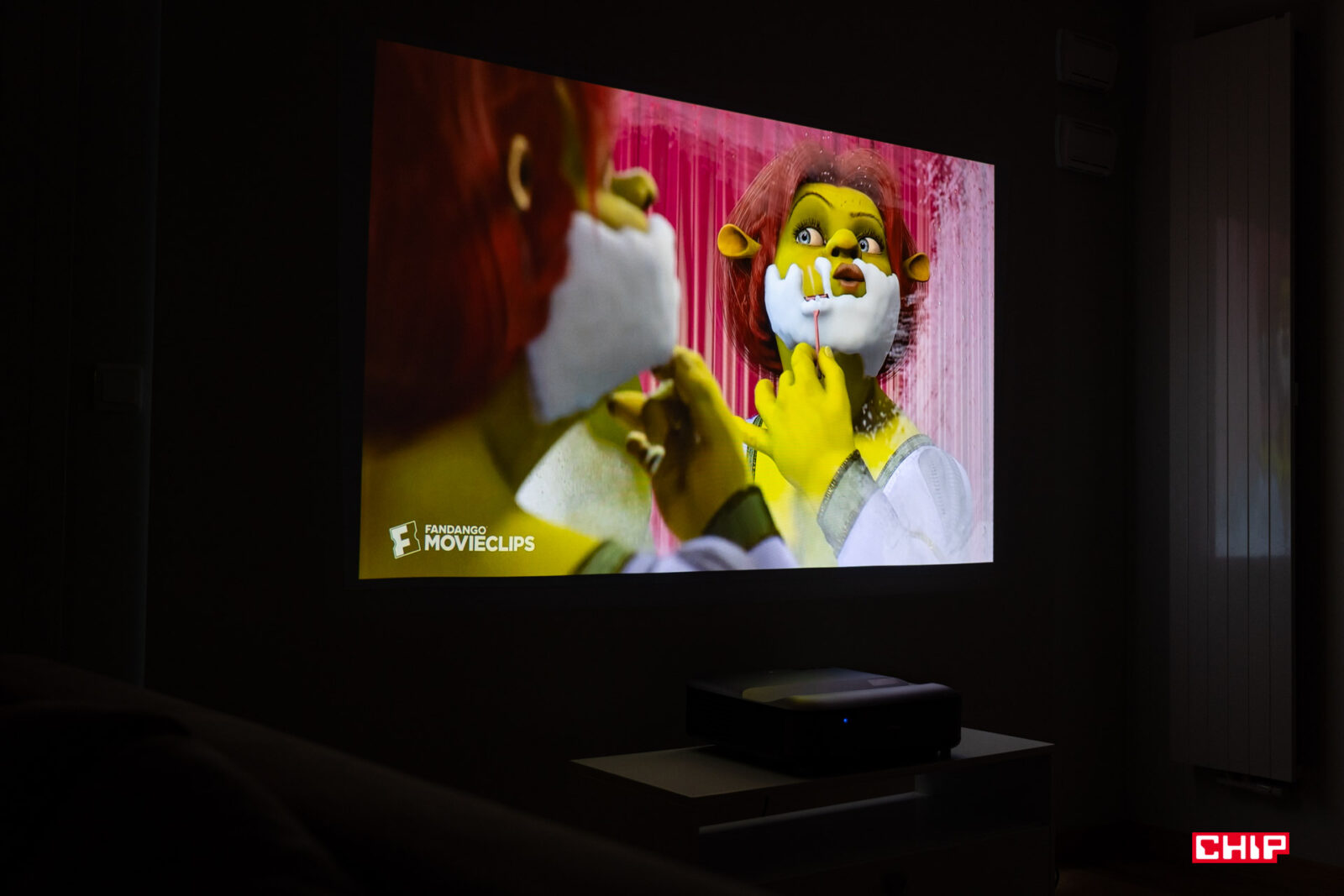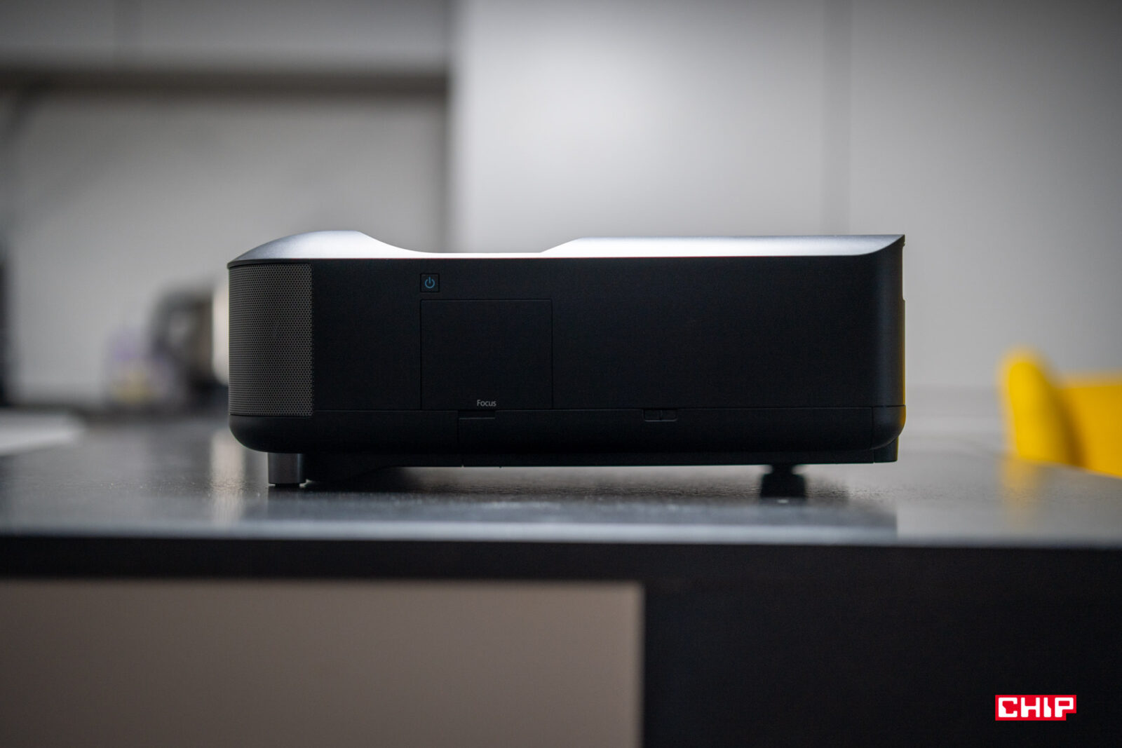 W dużym uproszczeniu, w środku takiego projektora obraz przechodzi przez szereg soczewek i jest przy okazji powiększany. Strumień światła wychodzi z projektora pod dużym kątem, przez otwór w górnej części obudowy, więc dystans do powierzchni projekcyjnej jest ekstremalnie krótki. Wystarczy wspomnieć, że już na dystansie rzędu 3-4 cm od ściany testowany model jest w stanie wyświetlić obraz o przekątnej sięgającej 60″. Możemy więc swobodnie postawić urządzenie na niskiej szafce pod ścianą, którą do tej pory zajmował telewizor o podobnej przekątnej. Jestem ogromnym fanem tego typu rozwiązań, bo zbliżają one doświadczenie z punktu widzenia typowego użytkownika do tego, z czym stykamy się podczas obsługi typowego odbiornika TV.