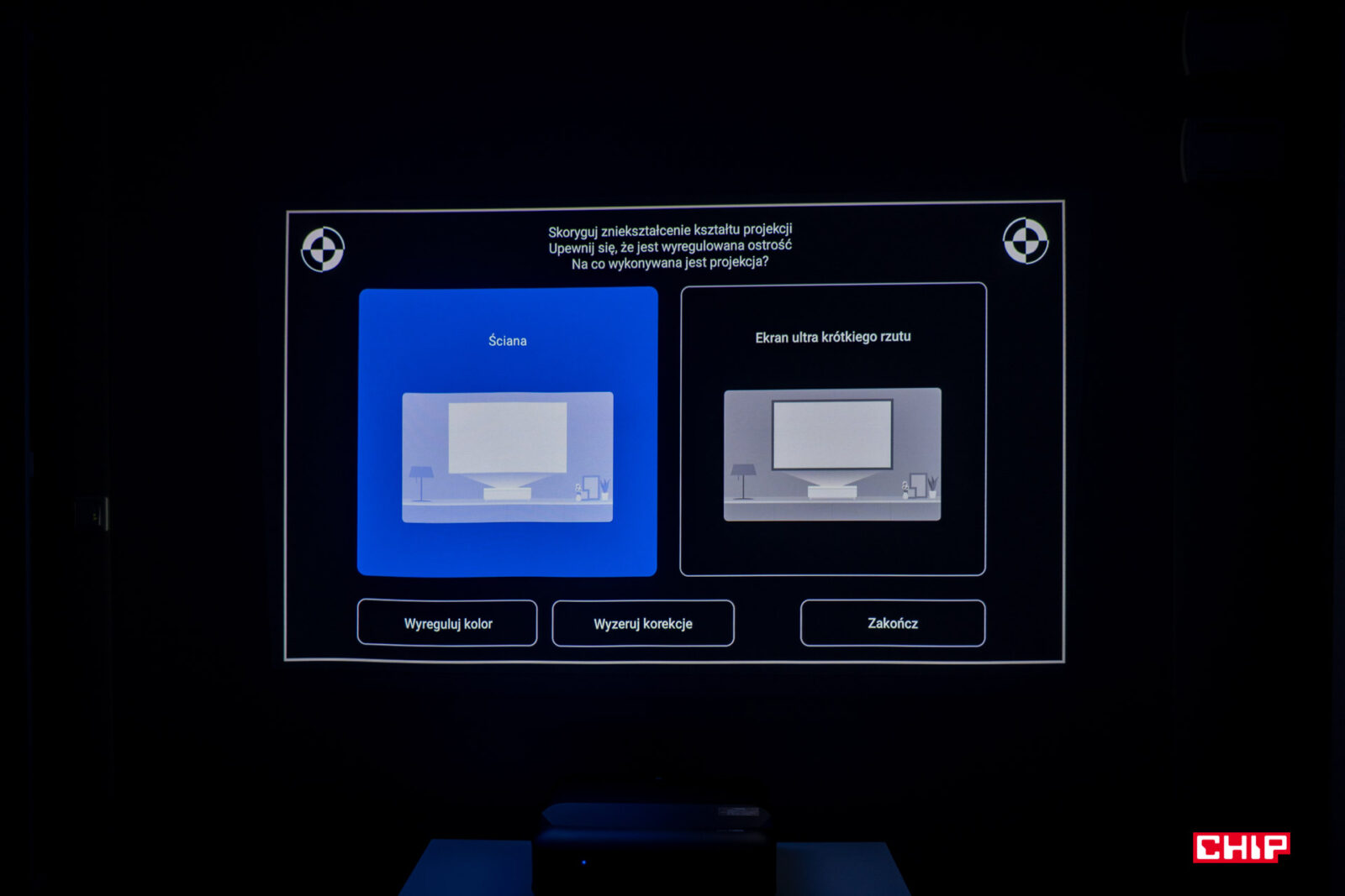 Drobną korektę nachylenia względem ściany umożliwiają dwie nóżki z gwintem umieszczone pod systemem audio. Regulacji ostrości dokonujemy z kolei przez osobne pokrętło ukryte pod klapką, przy włączniku po prawej stronie.