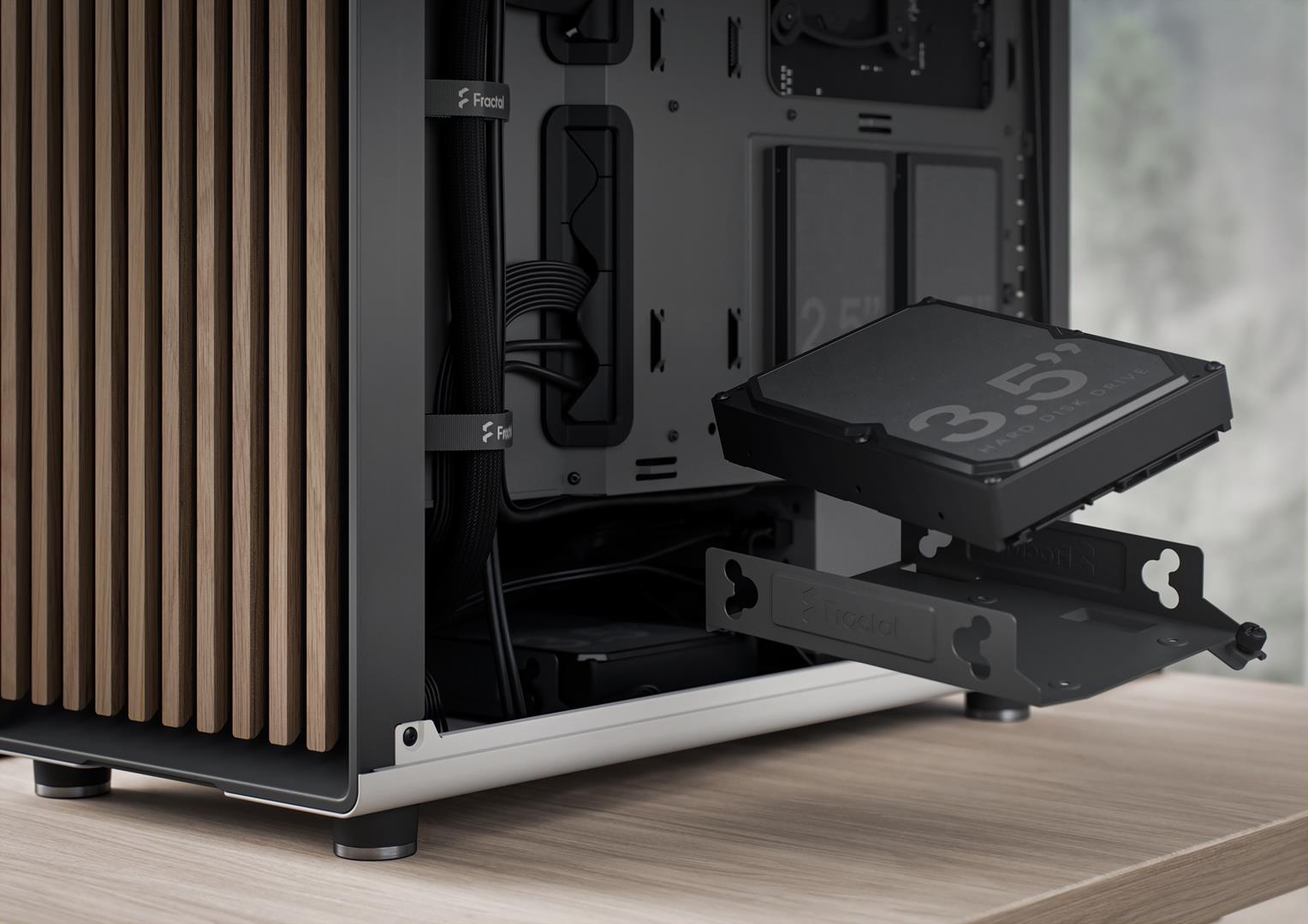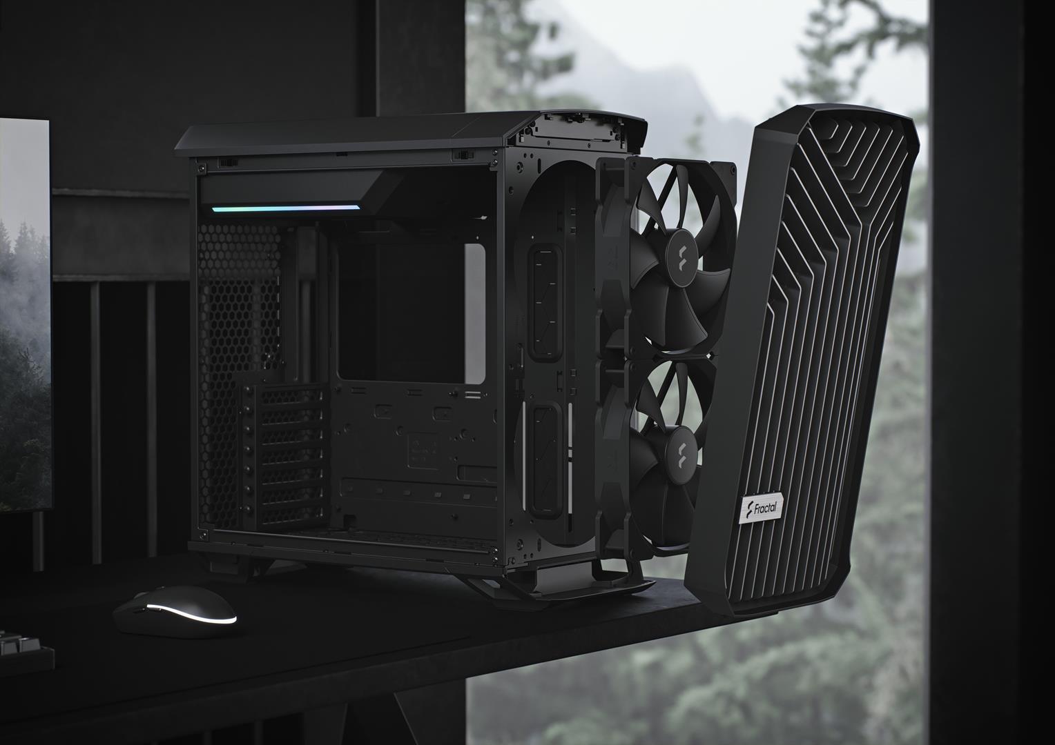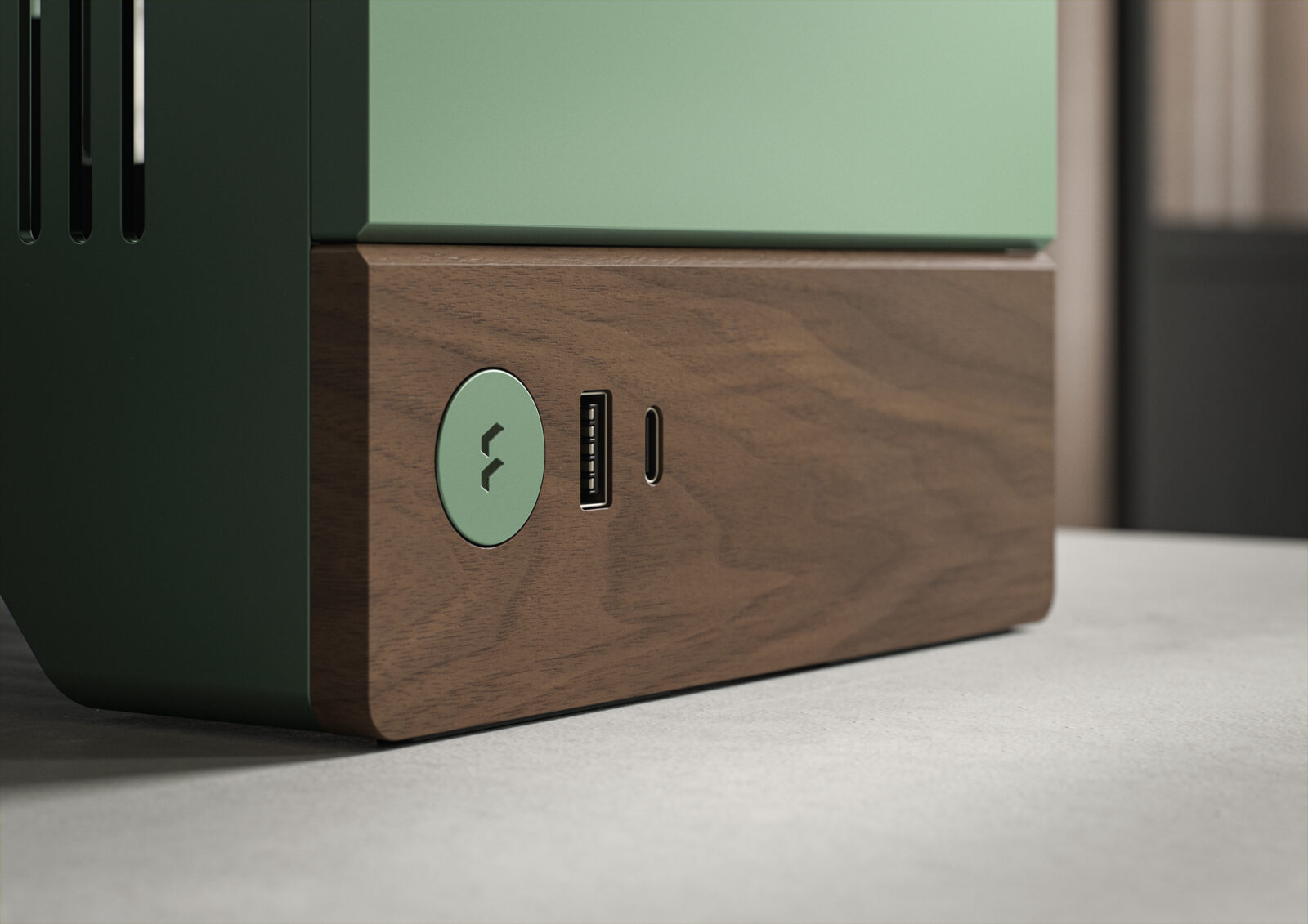 Nie wszyscy mają miejsce na wielkie skrzynie i nie wszyscy chcą tak wielkie obudowy regularnie przenosić, jeśli akurat często są do tego zmuszeni. Dla takich klientów Fractal przygotował wyjątkową obudowę o nazwie Terra, która w dniu premiery miała zrewolucjonizować SFF, czyli kompaktową formę komputerów dla graczy. Składają się na nią grube panele wycięte z anodowanego aluminium, których wykończeniem zajęła się maszyna CNC, ale tym najbardziej znaczącym zwieńczeniem projektu jest część przedniego panelu wykonanego z certyfikowanego drewna orzechowego.