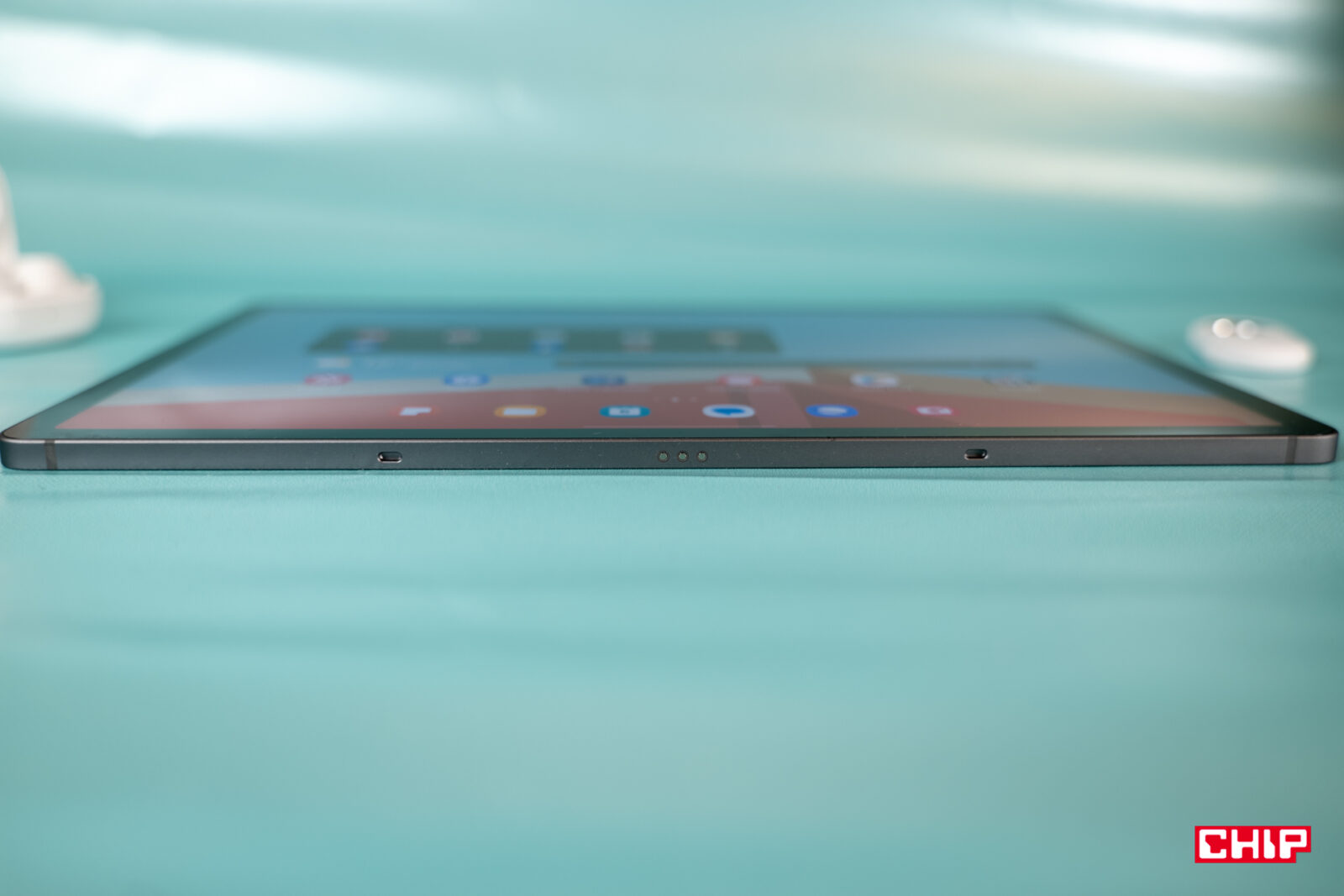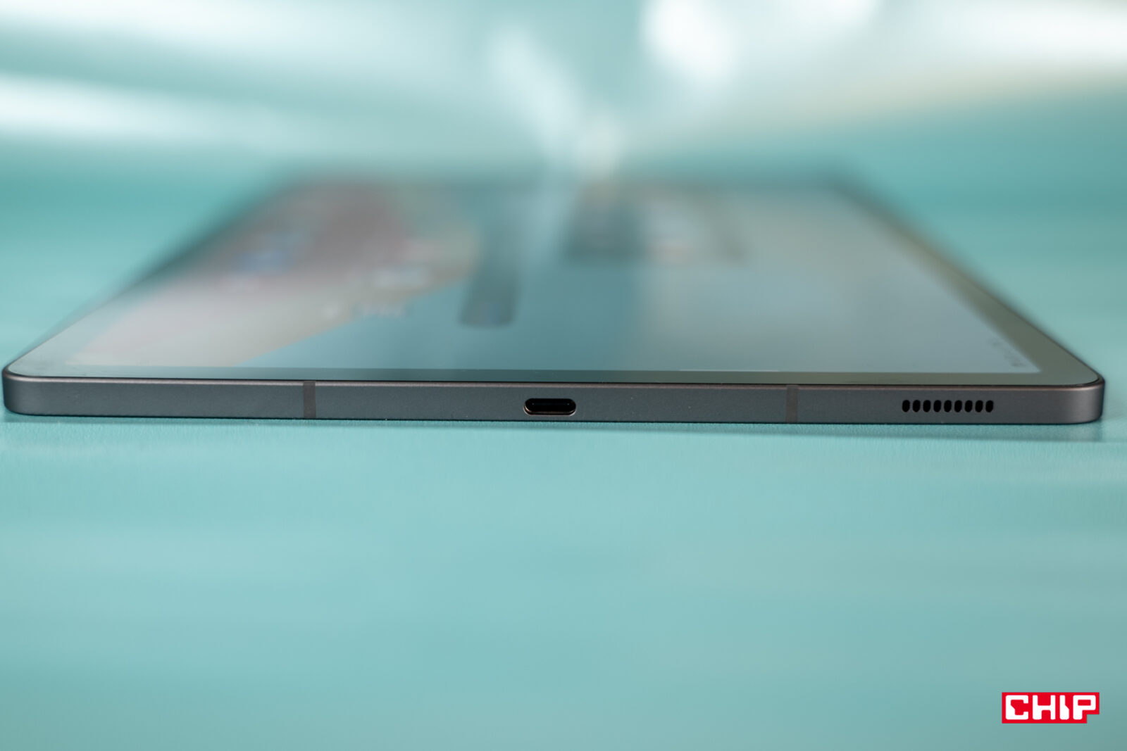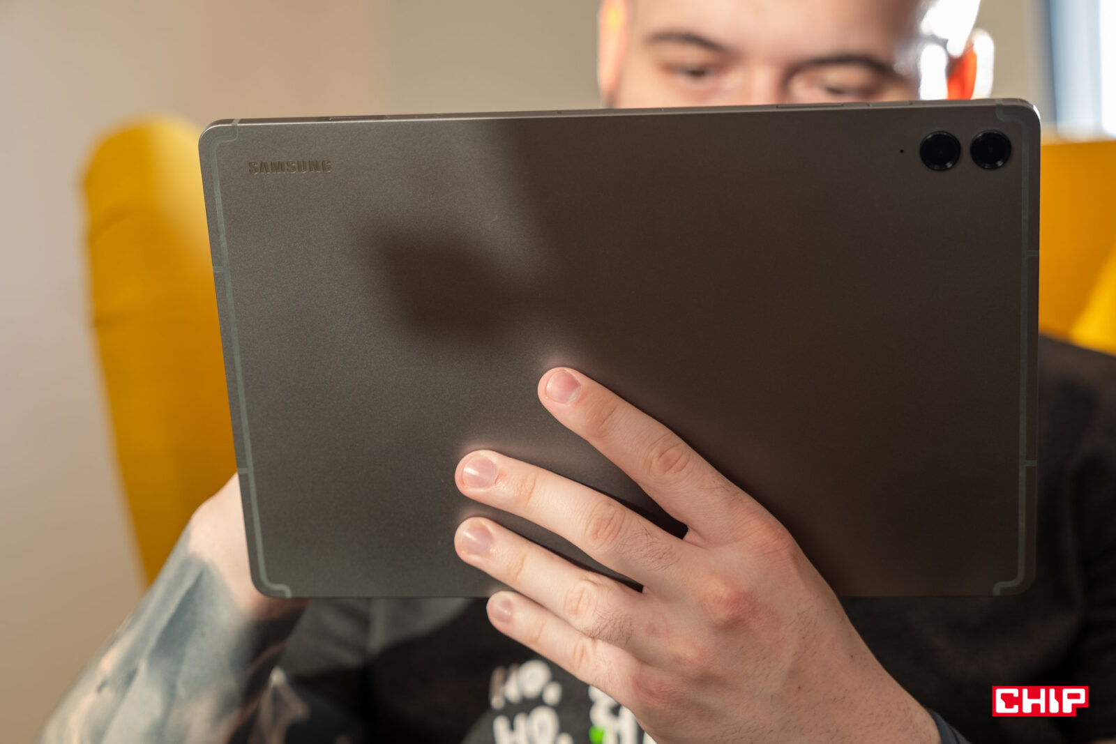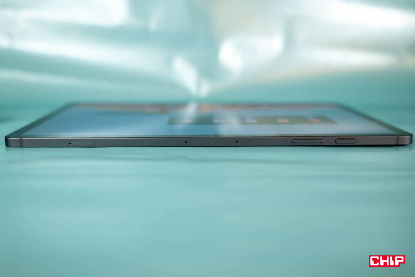 To oczywiście sytuacja wypadkowa, ale certyfikat IP68 sprawił, że nie miałem obawy o stan sprzętu. Bez problemu może on znajdować się w okolicy basenu czy towarzyszyć nam podczas deszczowych eskapad, chociażby w góry. Aby osiągnąć taki stan, obudowę trzeba było zbudować z poszanowaniem jakości. Zastosowane aluminium nie ugina się przy żadnej krawędzi, a matowy finisz czyni chwyt przyjemnym. Jak na swoje wymiary – w końcu to tablet z 12,4-calowym ekranem – całość nie jest dyskwalifikująco ciężka – 627 gramów odczujecie w dłoni, ale nie będziecie też trzymać urządzenia jak smartfonu przez większość czasu.
