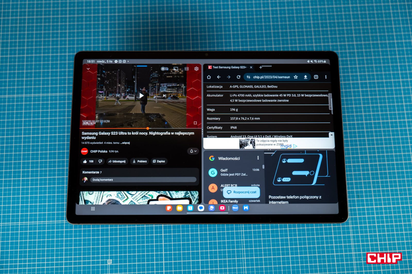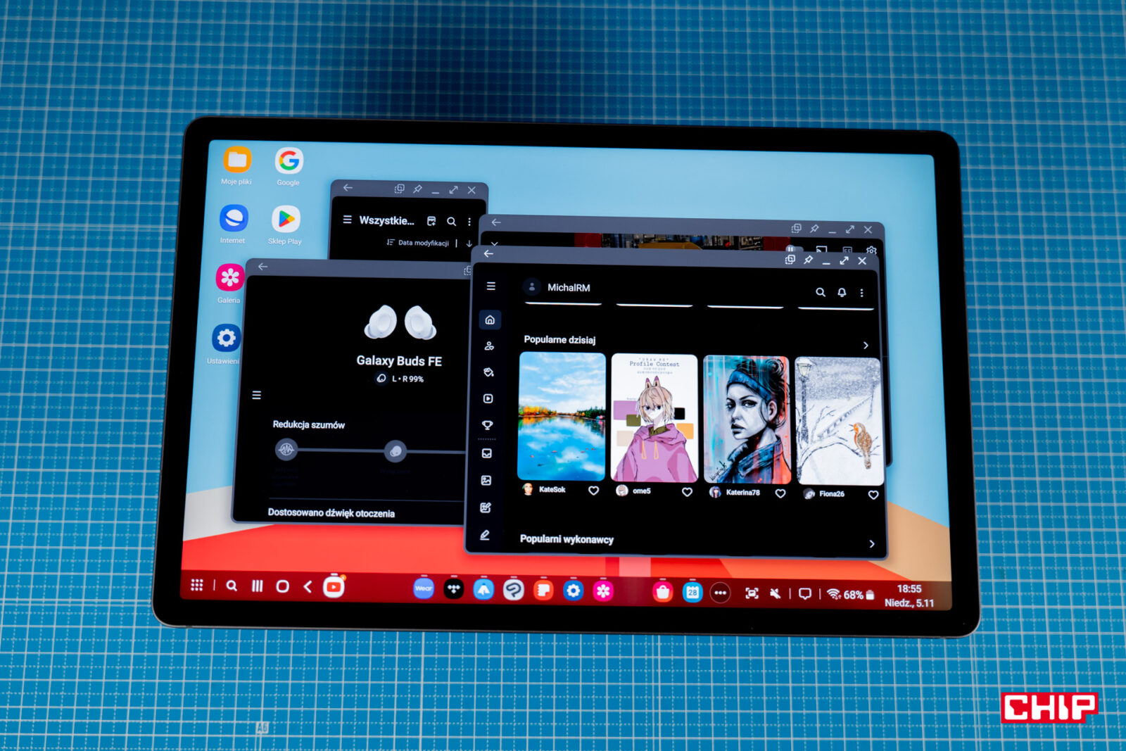 Powitajcie interfejs Samsung DeX, przypominający doświadczeniem to, co znamy z komputerów. Ikony na ekranie ustawimy w rzędzie niczym na komputerowym pulpicie, a pasek w dolnej części wyświetli aktywne procesy, do których możemy wrócić. Na ekranie uruchomimy znacznie więcej okien, które możemy miniaturyzować lub zmieniać ich przezroczystość oraz przypinać do ekranu. Układ obliczeniowy Exynos 1380 spisuje się w takiej wielozadaniowości całkiem dobrze. Na aplikacje nie trzeba czekać długo, a przełączanie się między nimi nie wymaga odświeżania każdej z nich. Ten drugi aspekt to zasługa 8 GB RAM-u w Galaxy Tab S9 FE+, które rozszerzymy do 12 GB dzięki opcji RAM Plus.