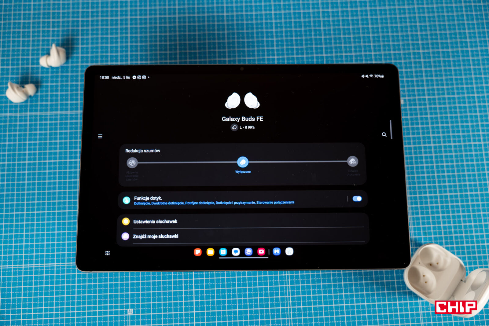 Między trybami aktywnej redukcji szumów a przepuszczaniem dźwięku przełączymy się za pośrednictwem płytki dotykowej. Tu kolejny plus konstrukcji Samsung Galaxy Buds FE – płytka dotykowa stanowi spory element całej konstrukcji i bardzo łatwo namierzyć ją palcem. Sama powierzchnia dotykowa także jest spora i reaguje na wielokrotne dotknięcia. Jeśli jednak chcemy opierać się na obsłudze tylko za pomocą telefonu, to funkcje dotykowe możemy wyłączyć lub zaprogramować tylko ich część.