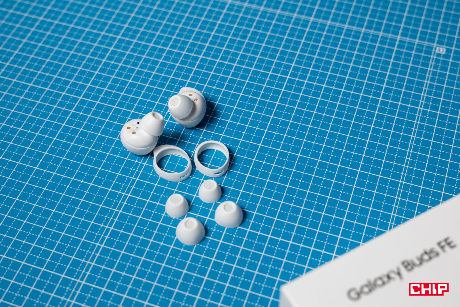 Jak dochodzi do takiego testu? To zasługa systemu wbudowanych mikrofonów. W słuchawkach Samsung Galaxy Buds FE znajdziemy ich łącznie aż 6 – po trzy na każdą słuchawkę, z czego po jednym wewnętrznym i po dwóch zewnętrznych. To one odpowiadają za wyciszenie dźwięków otoczenia, ale także i za ich przepuszczanie. To drugie jest szczególnie przydatne, by słyszeć otoczenie bez zdejmowania słuchawek, na przykład podczas treningu. W przypadku tego rozwiązania w ustawieniach aplikacji Galaxy Wearable zmienimy intensywność przychodzącego dźwięku z podziałem na ucho oraz głośność i klarowność dźwięku. Aplikacja daje ten sam poziom zaawansowania, co w przypadku najdroższych słuchawek.