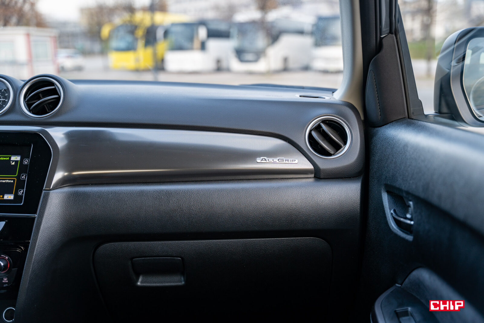 Ceny Vitary z układem mild hybrid wahają się między 95 900 zł a 127 900 zł. O ile nie macie wyboru w kwestii pojemności silnika, czy mocy, możeście wybrać opcję z napędem na jedną lub obie osie oraz skrzynię biegów. „Nasz” egzemplarz został wyposażony w napęd 4WD i skrzynię manualna, do tego wersję wyposażenia Elegance, plasująca się mniej więcej w połowie stawki pod względem ilości udogodnień. Mamy tutaj LED-owe reflektory, przyciemniane tylne szyby, elektrycznie regulowane, podgrzewane, składane lusterka, klimatyzację automatyczną, 7-calowy dotykowy ekran, podgrzewane przednie fotele, kametę cofania, czujniki parkowania przód/tył, Android Auto Apple CarPlay, nawigację, tapicerkę z połączenia zamszu i skóry syntetycznej i dosyć szeroki pakiet bezpieczeństwa w którym jednak zabrakło systemu monitorowania martwego pola. Nie jestem w stanie powiedzieć Wam jak zostało to ocenione na tle konkurencji, bo Vitara co prawda otrzymała komplet pięciu gwiazdek w testach Euro NCAP, ale było to w 2015 roku, więc ważność testu wygasła, a wszyscy doskonale zdajemy sobie sprawę z tego, że w ciągu tych 8 lat świat poszedł do przodu, a w raz z nim – standardy bezpieczeństwa.