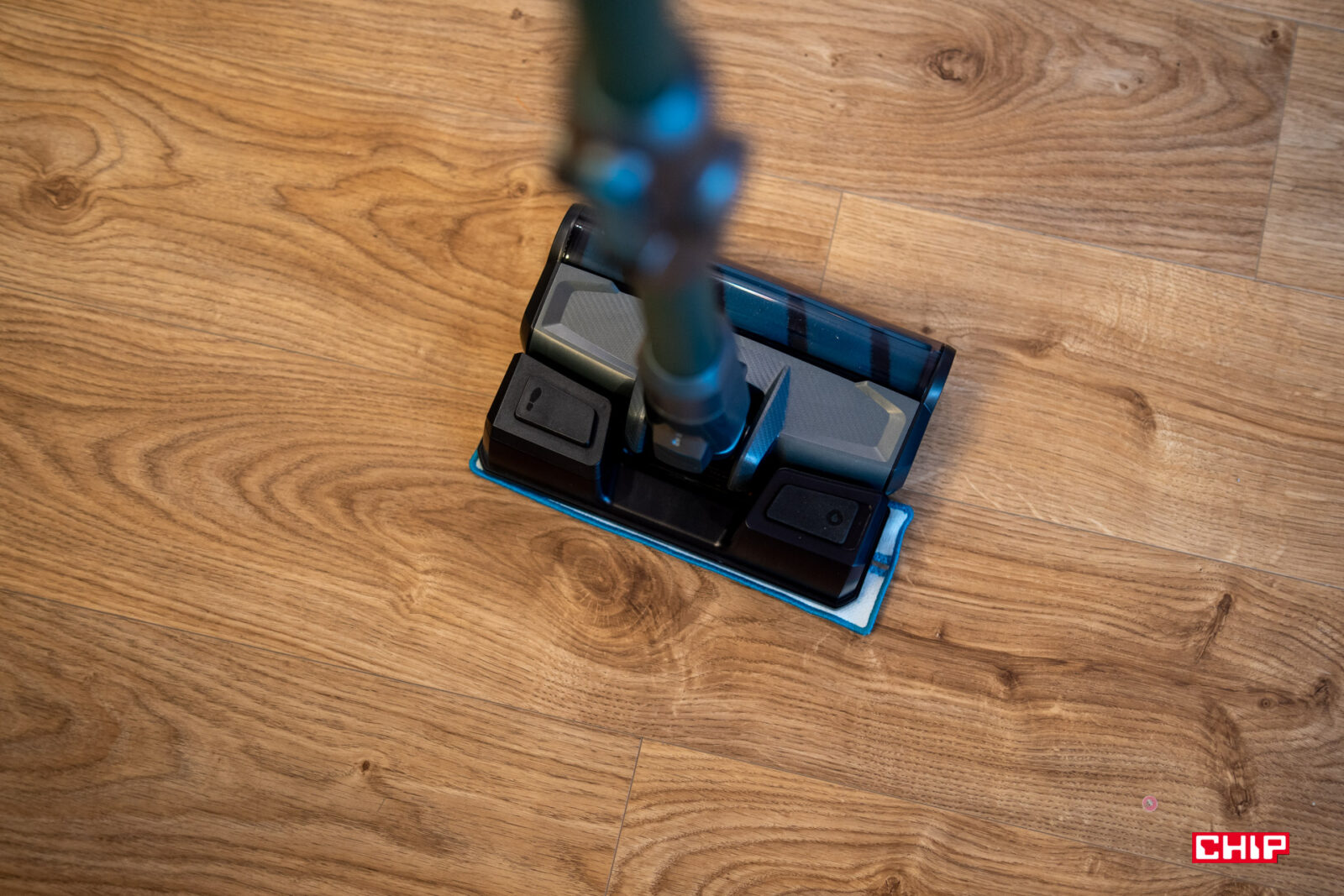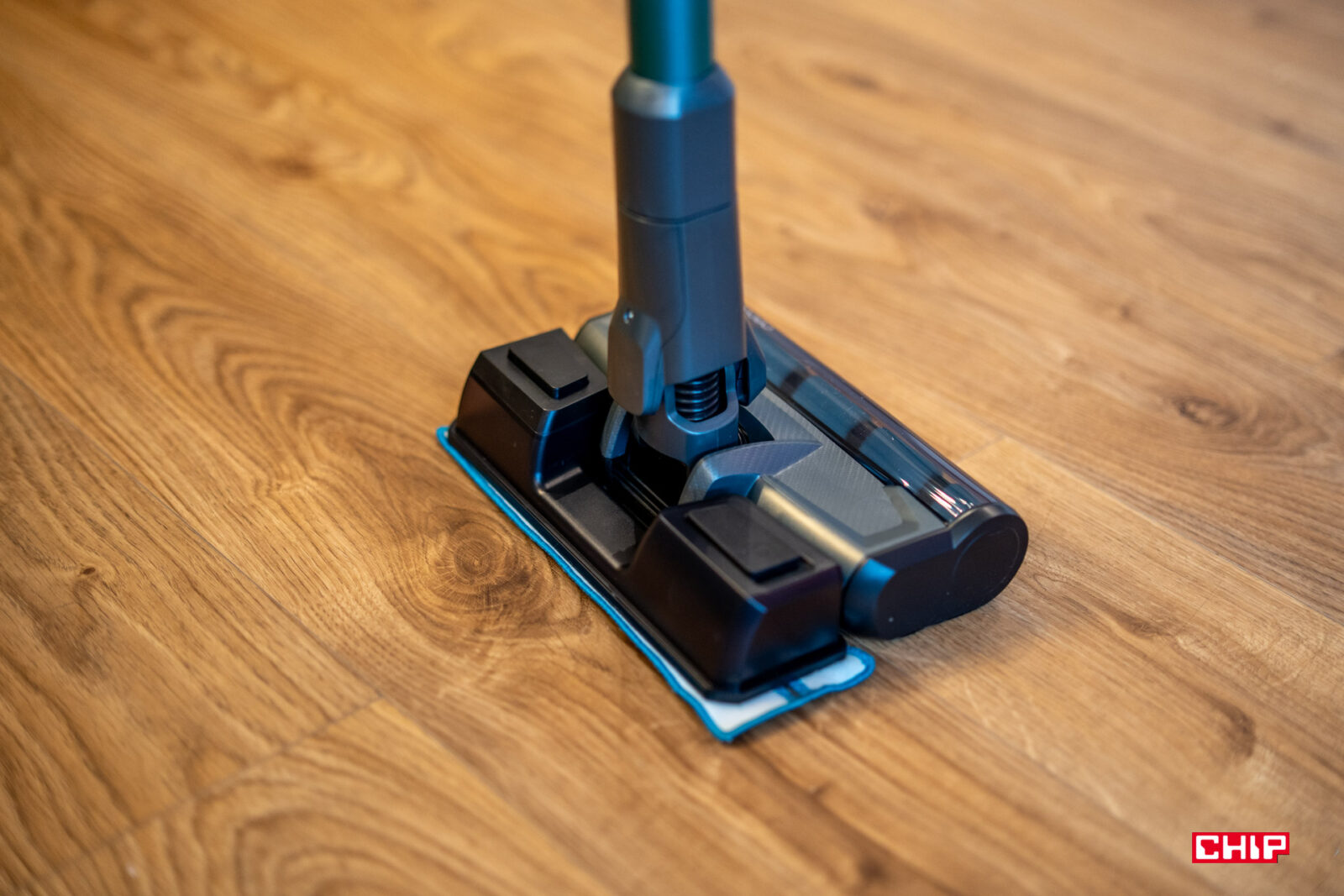 Mopowanie za pomocą Cecotec Conga Rockstar 1700 X-Treme Ergowet nie jest czymś wymyślnym. Z pojemnika na wodę, pod wpływem wibracji odkurzacza dawkowana jest woda, która nasącza końcówkę mopującą i… szorujemy. Do środka można dodać minimalną ilość płynu do podłóg, ale z umiarem. Inaczej będą się lepić. Mop musi być przytwierdzony do szczotki głównej, nie ma innego wyjścia i tutaj pojawia się dodatkowa zaleta szczotki. Dzięki temu, że ma krótkie, walcowane włosie nie brudzi się tak jak w przypadku długiego włosia i bardzo dobrze współgra z mopem, dodatkowo wycierając podłogę. Więc choć sama konstrukcja jest tutaj prosta, to bardzo dobrze ze sobą współpracuje.