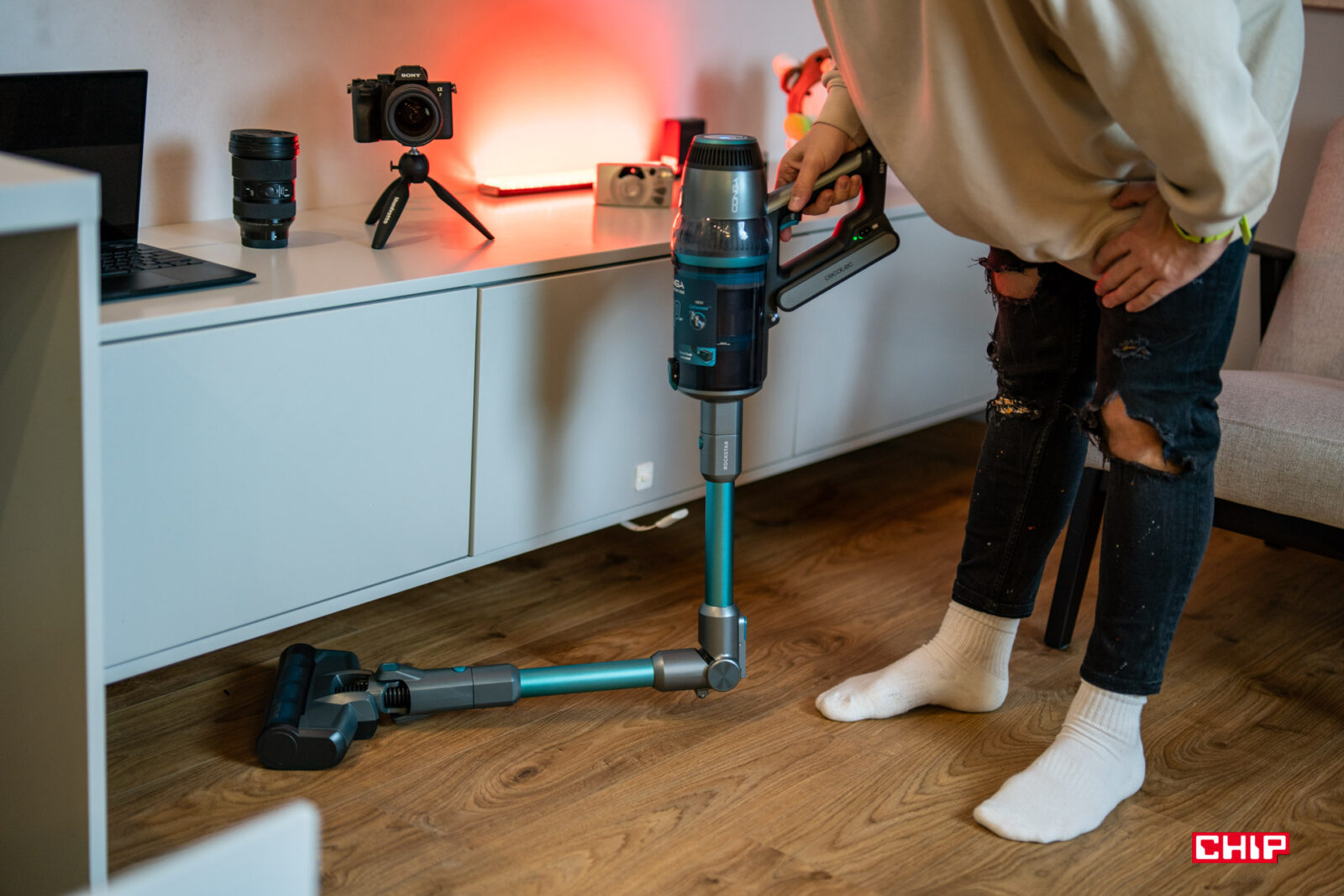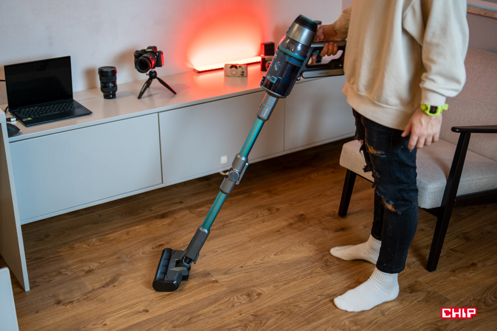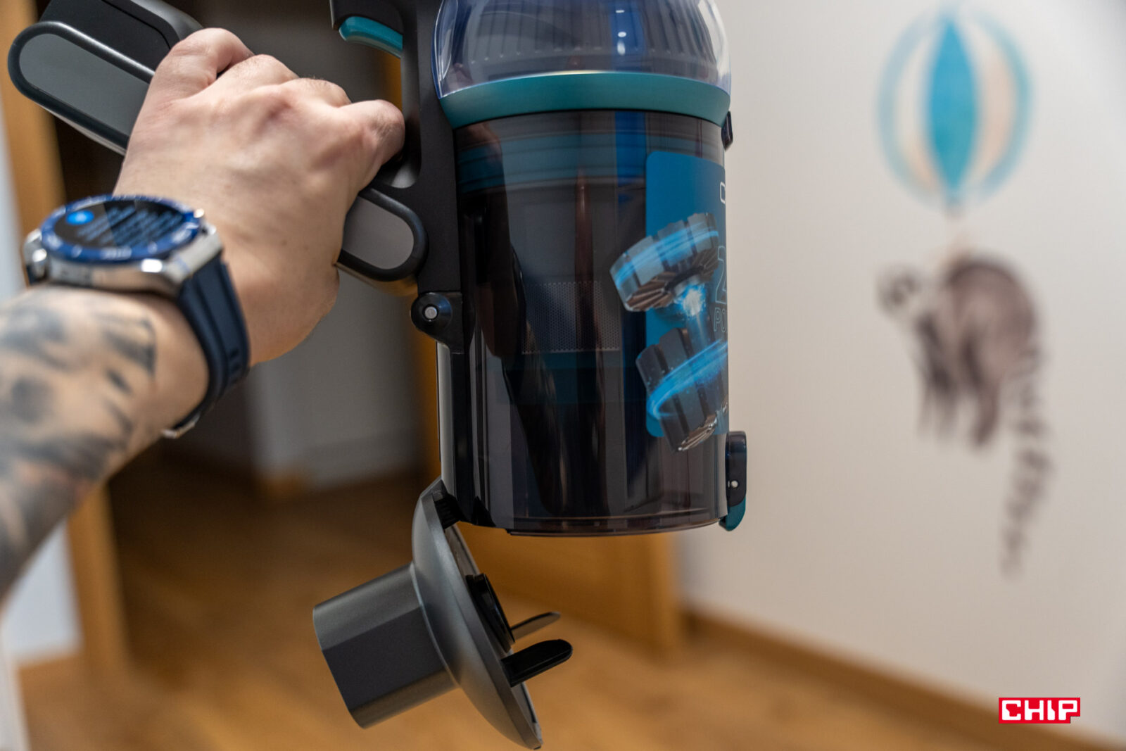 Zacznijmy od wad odkurzacza. Pierwszą jest brak możliwości postawienia go pionowo. Musimy go albo o coś oprzeć, albo przytwierdzić do ściany uchwyt znajdujący się w zestawie i tam go dokować (a przy okazji ładować). Rura nie ma żadnego zatrzasku, więc całość zwyczajnie upada po postawieniu. Druga to stosunkowo głośna praca. To nie jest nie wiadomo jaki huk, ale Cecotec Conga Rockstar 1700 X-Treme Ergowet pracuje zwyczajnie jak typowy odkurzacz. Producent mówi o hałasie na poziomie 88 dB. Trzecia rzecz to być może wada testowanego egzemplarza, ale kółka głównej szczotki trochę skrzypią. Z czasem problem może narastać, miałem tak swego czasu w jednym z pionowych odkurzaczy Xiaomi i po pół roku zgrzyt był niemiłosierny.