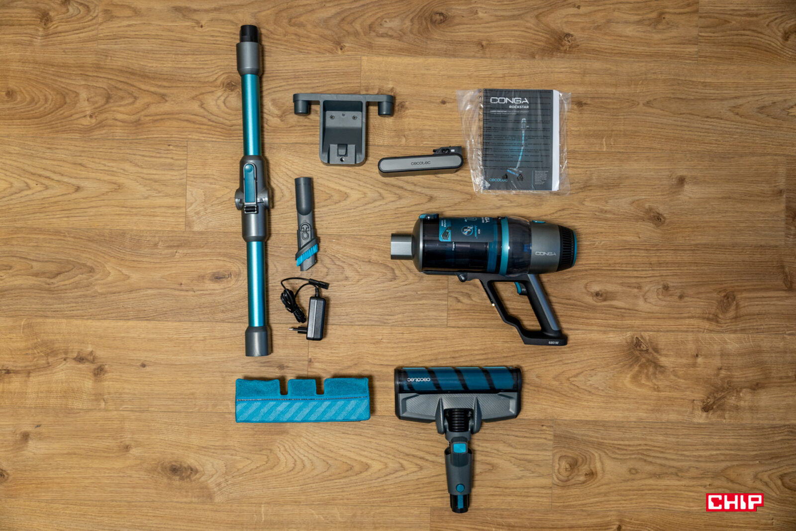 Zestaw sprzedażowy jest raczej typowy dla tej klasy sprzętu. Znajdziemy w nim główny element odkurzający z silnikiem i pojemnikiem na zabrudzenia, składaną rurę, końcówkę główną, szczotkę do kurzu, nakładkę mopującą oraz uchwyt ścienny.