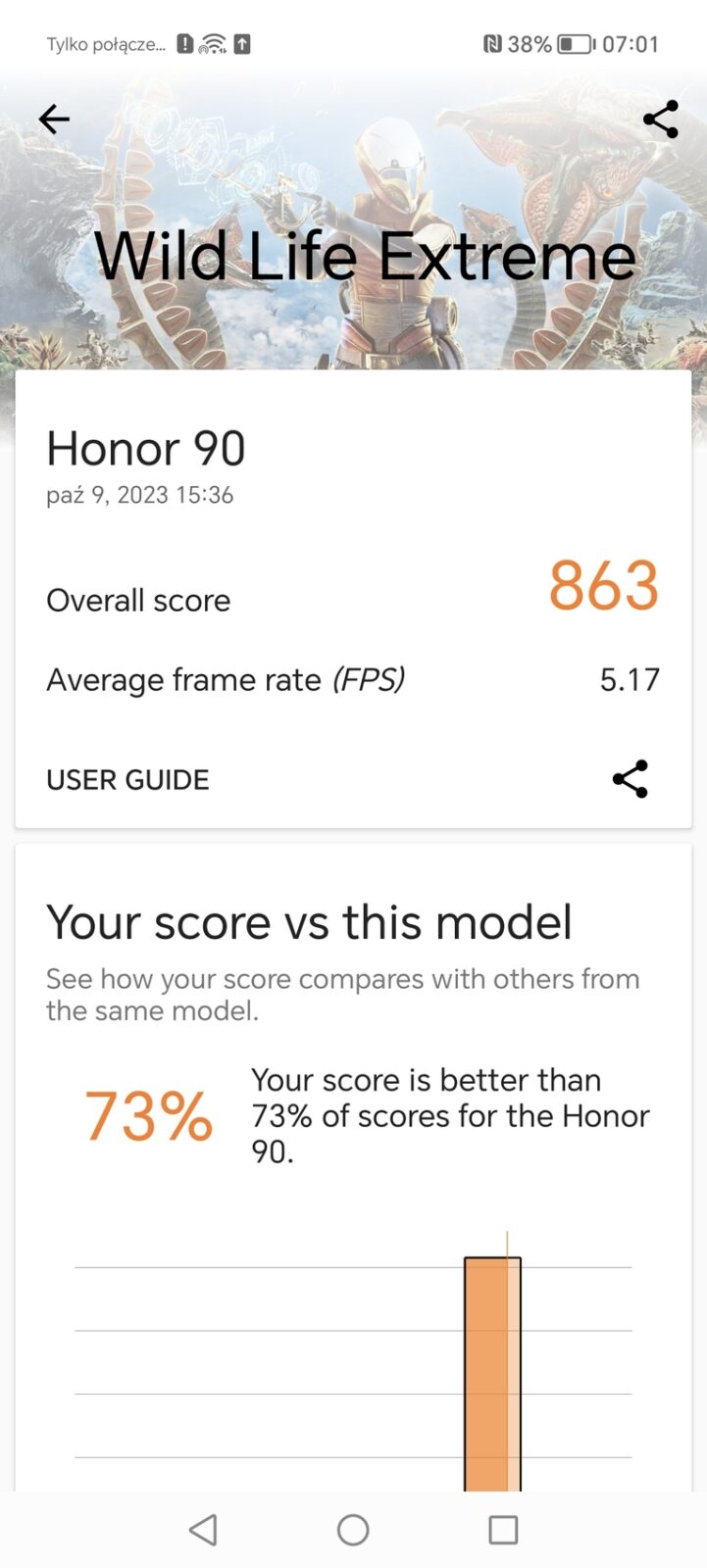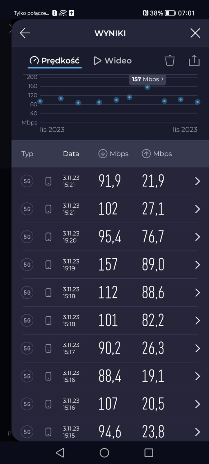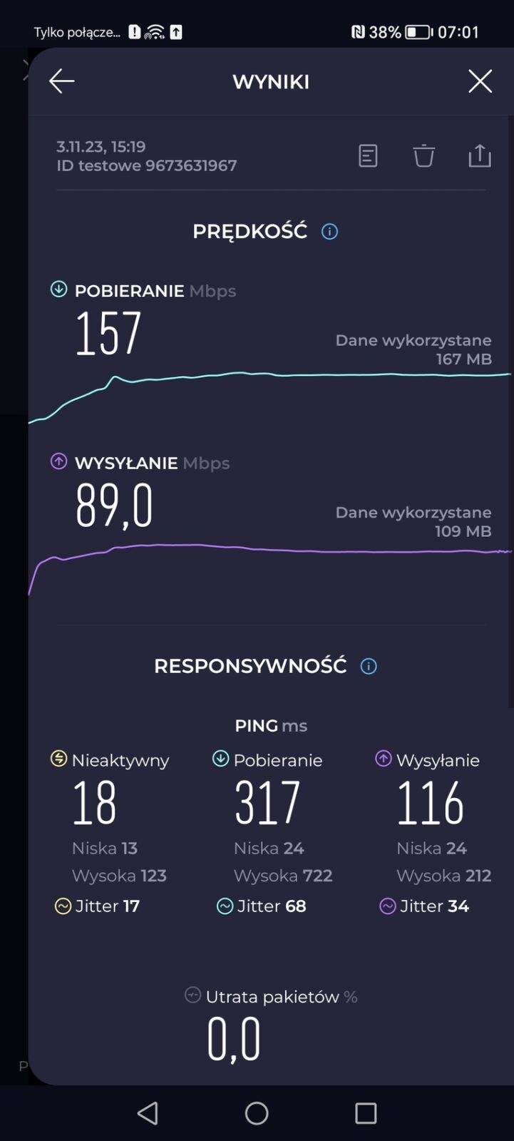 Honor w przeciwieństwie do Huaweia nie mierzy się z embargami nałożonymi przez USA, dlatego Honor 90 został oczywiście wyposażony w łączność 5G. W 10 próbach w programie Speedtest, uzyskałem maksymalnie 157 Mb/s (pobieranie) i 89 Mb/s (wysyłanie danych). Wynik uzyskany praktycznie w samym centrum Warszawy (w sieci Orange). Będąc poza zasięgiem 5G i LTE, możemy oczywiście skorzystać z Wi-Fi 6. Przez cały okres testów nie napotkałem problemów z prędkością lub stabilnością łącza.