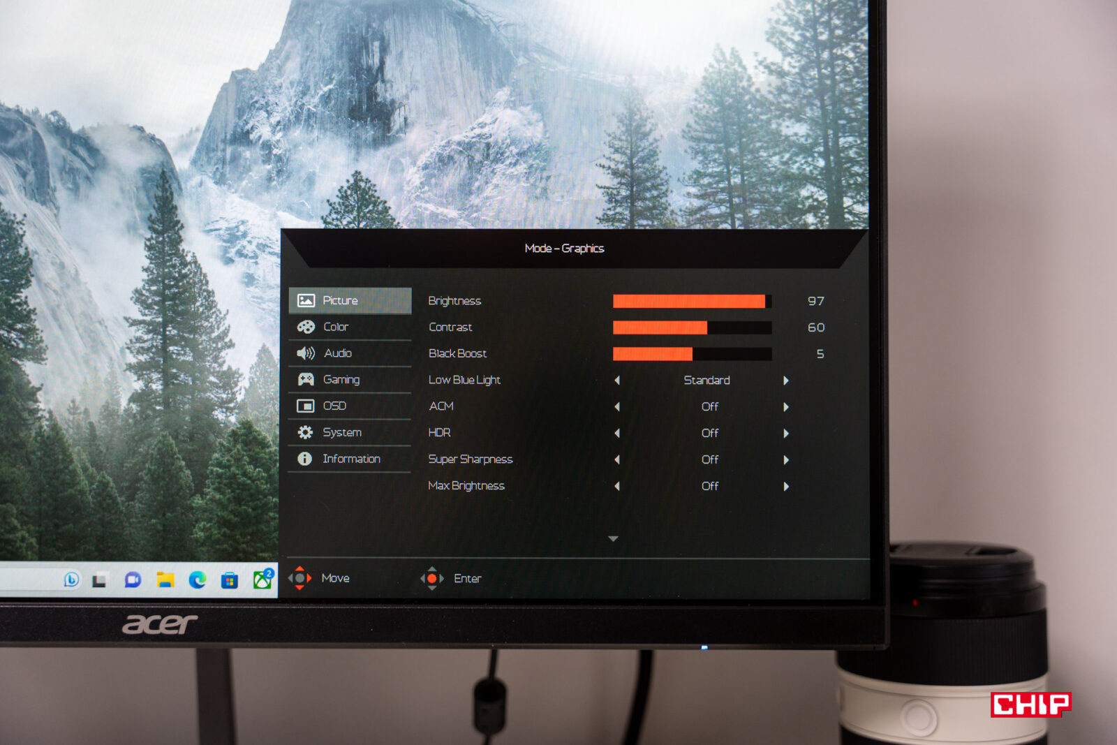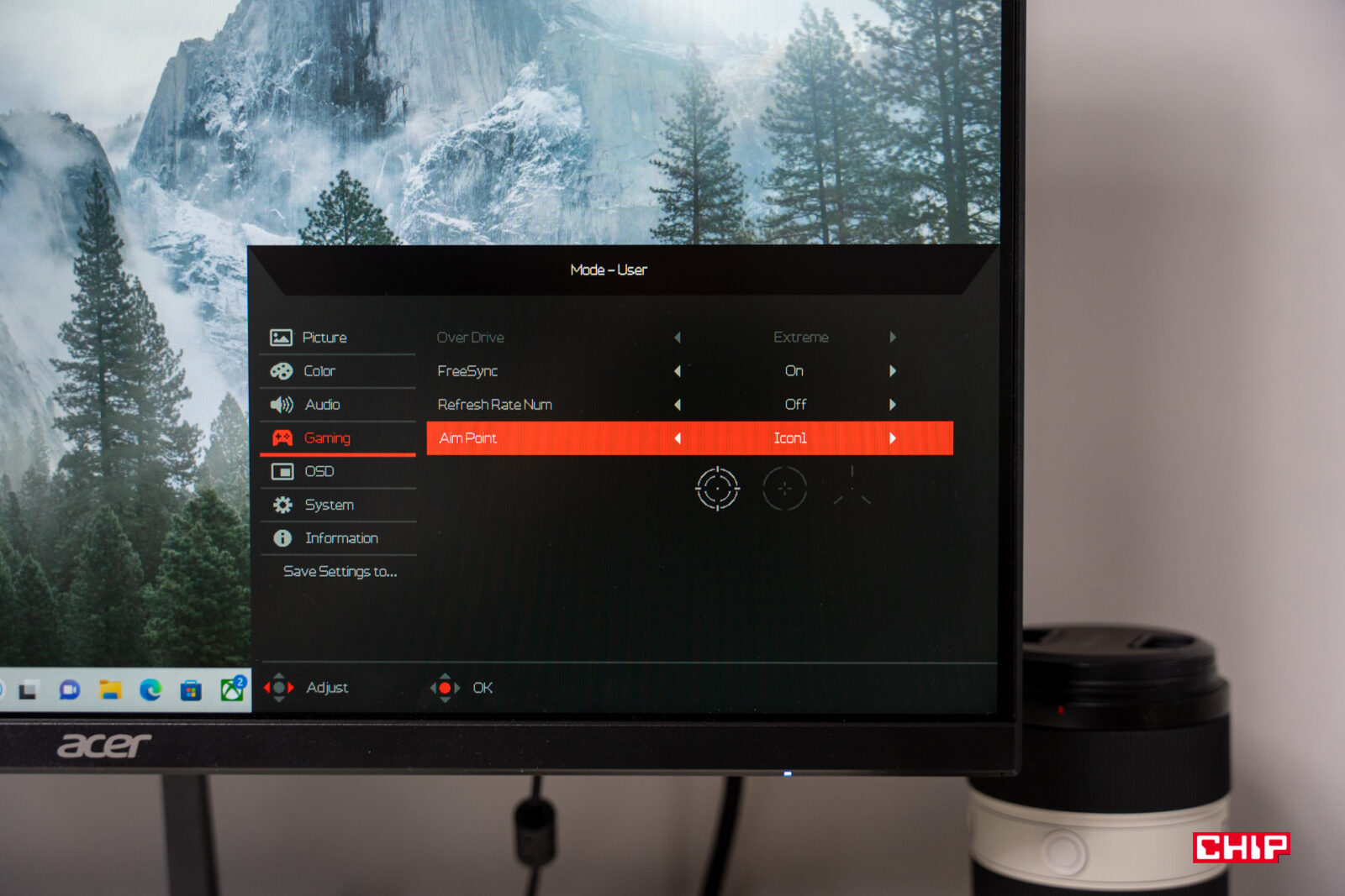 Wspomniałem już o przejrzystym menu – znalazły się w nim tryby dostosowane do różnych rodzajów aktywności, w tym trzy powiązane z grami (osobno do gier akcji – gdzie na ekranie pokazuje się celownik – wyścigów oraz produkcji sportowych), a także tryb graficzny, którego aktywacja powoduje większy pobór mocy. Każde z tych ustawień ma swoje własne parametry związane z jasnością, głębią kolorów i częstotliwością odświeżania. Oczywiście mają być one domyślnie najlepsze dla wybranej. Jeśli komuś nie odpowiadają ustawienia domyślne, sam może wybrać każdy z parametrów – Acer daje wolną rękę.