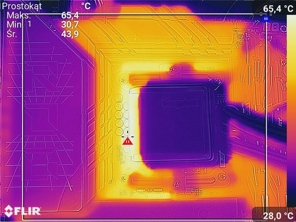Czujnik na płycie pokazywał 65°C. Konstrukcja nie ma problemów z utrzymaniem niskiej temperatury nawet przy mocnym obciążeniu procesora. Chłodzenie daje sobie bez wątpienia radę.