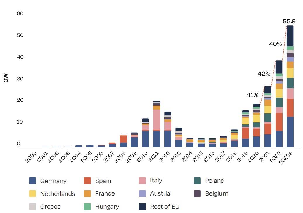 Sektor energetyki słonecznej w Europie odnotował fenomenalny wzrost z racji zauważalnego wzrostu liczby instalacji fotowoltaicznych w różnych państwach członkowskich. Ten wzrost adopcji energii słonecznej podkreśla zaangażowanie kontynentu w odnawialne źródła energii i jego kluczową rolę w globalnej zmianie w kierunku zrównoważonych źródeł energii. Wśród liderów znalazła się nawet Polska, stając na poziomie takich państw, jak Hiszpania, Niemcy, Włochy czy Holandia.