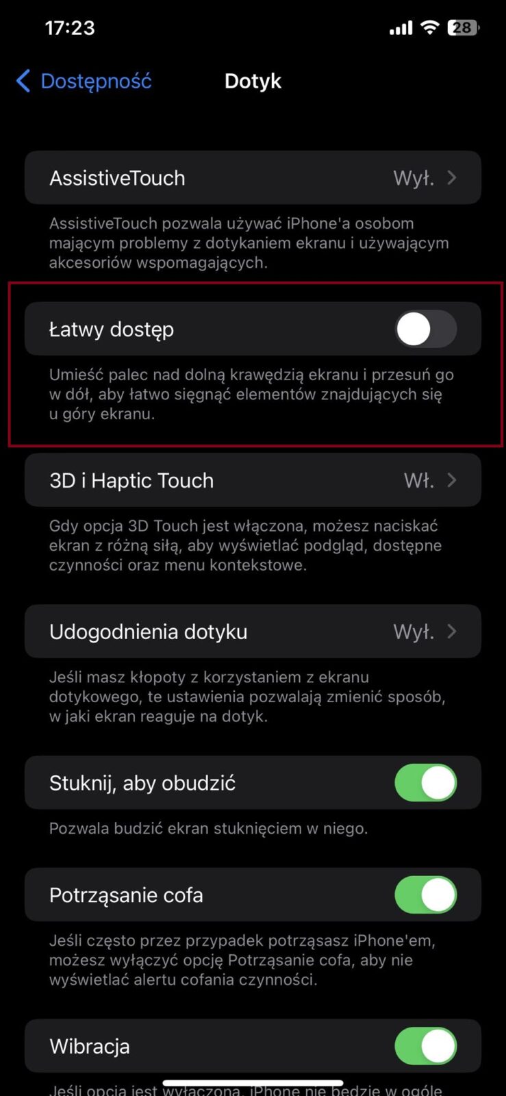 Czy da się coś z tym zrobić? Użytkownicy już znaleźli rozwiązanie, choć na pozór wydaje się, że nie ma ono z tym nic wspólnego. Jednak działa, a przynajmniej tak mówią osoby, które zmagały się z tym problemem. Należy wejść w Ustawienia, w sekcję Dostępność, a następnie wejść w Dotyk i tam należy wyłączyć funkcję Łatwy dostęp.