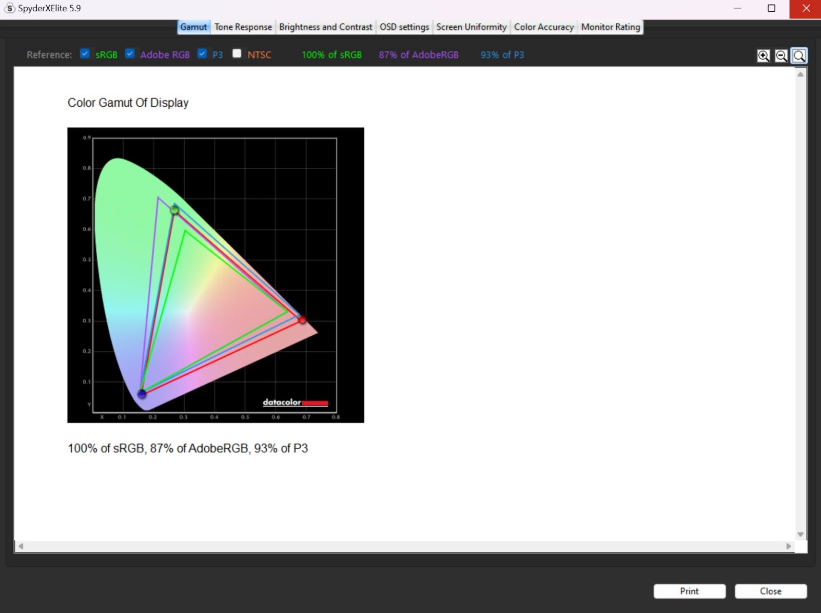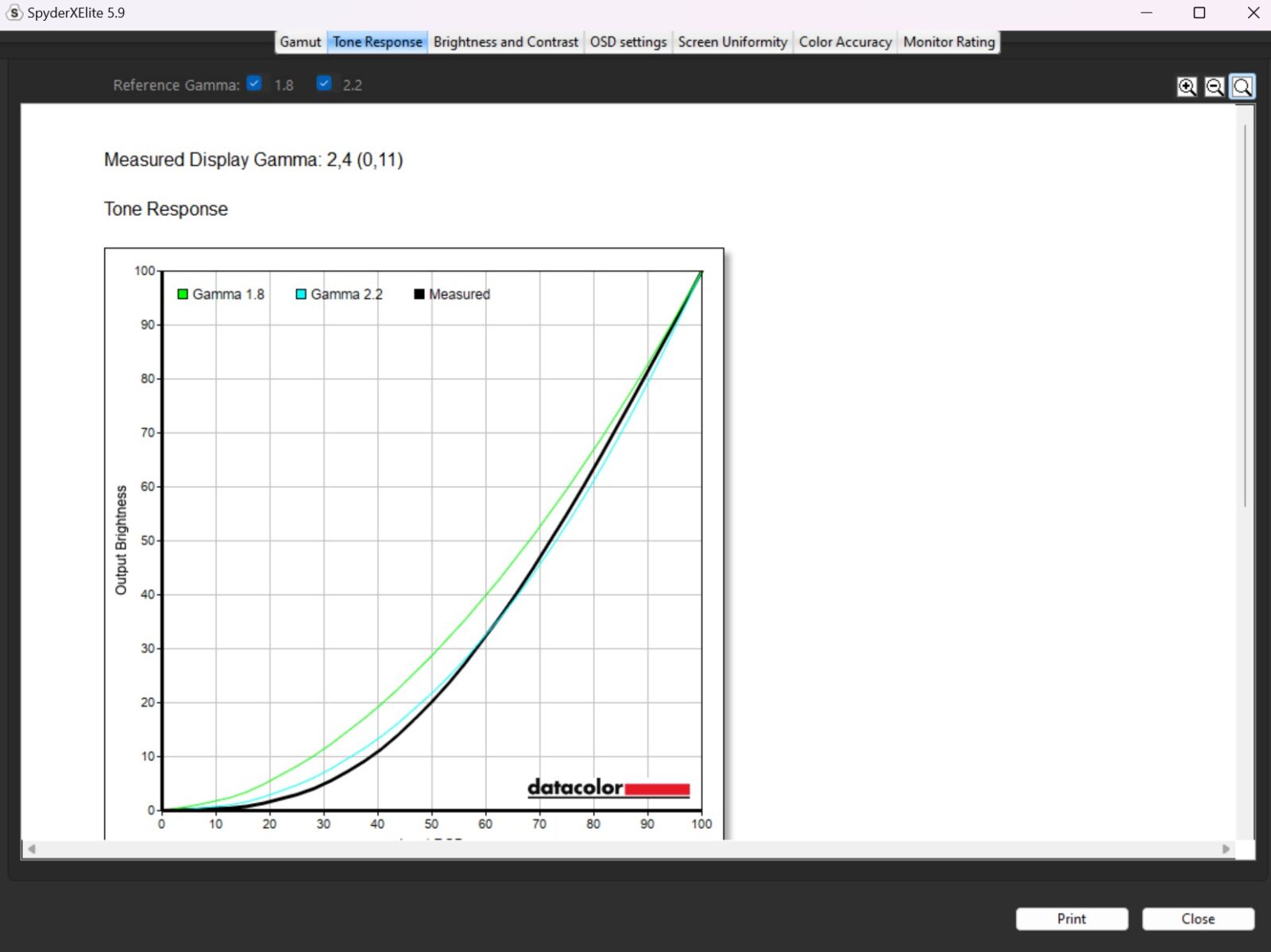 Pokrycie kolorów wypada nieźle. 100% sRGB, 87% AdobeRGB i 93% P3 bez profesjonalnej kalibracji i w podstawowym trybie, to dobry wynik, jak na tak wielki ekran, którego z pewnością można poprawić samymi ustawieniami. Odyssey Neo G9 G95NC słabo wypada jednak w kwestii odpowiedzi tonalnej, czyli tego, jak płynnie zmieniają się wartości szarości pod względem ich luminancji w stosunku do czystej czerni. Podobne braki dostrzec możemy w punkcie bieli, co jednoznacznie potwierdza, że jest to sprzęt bardziej dla graczy niż profesjonalnych twórców.