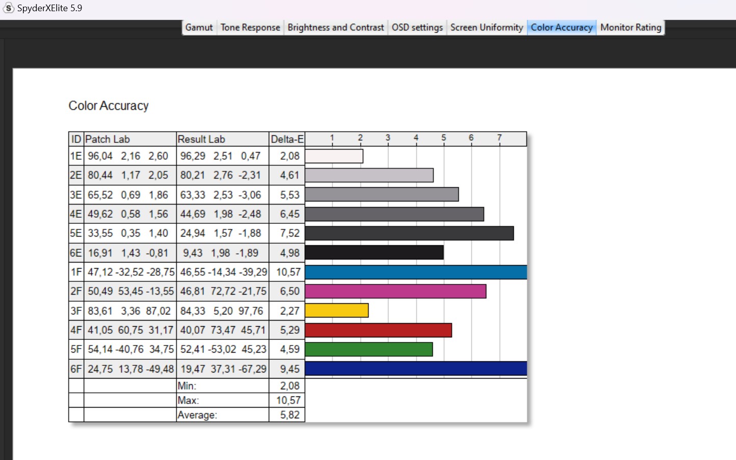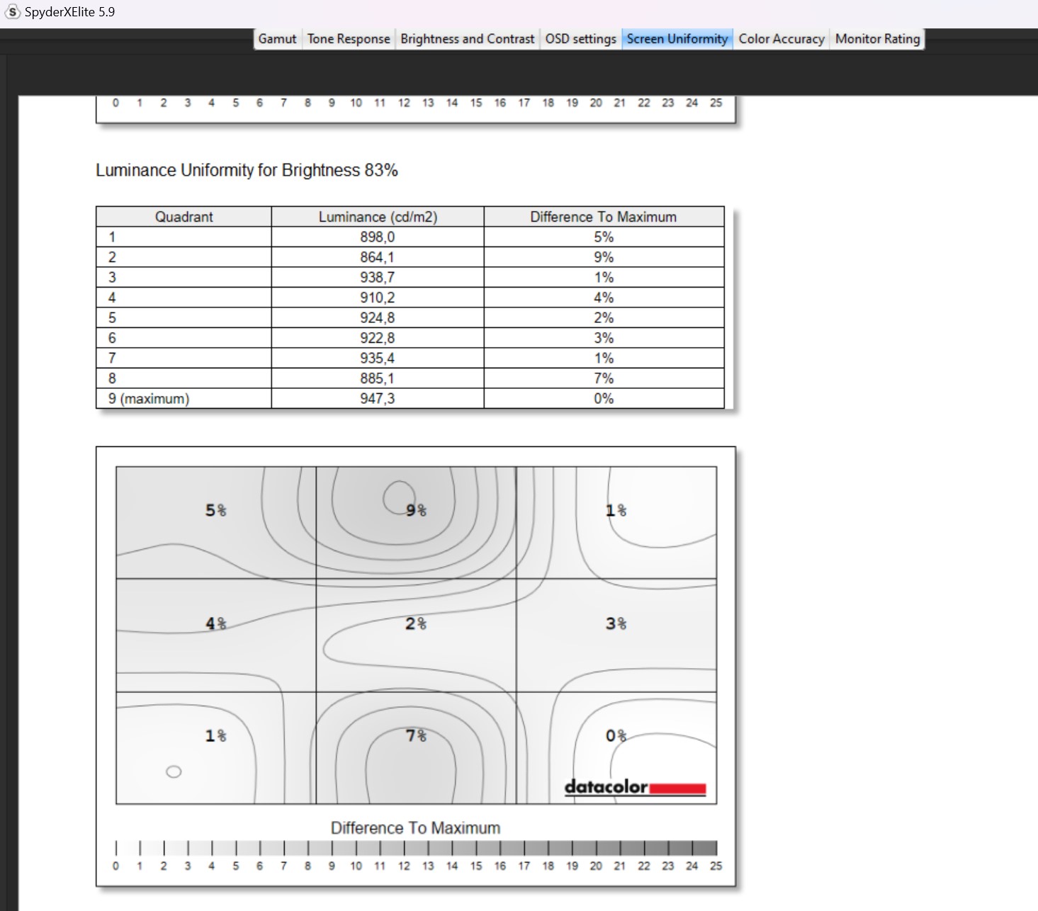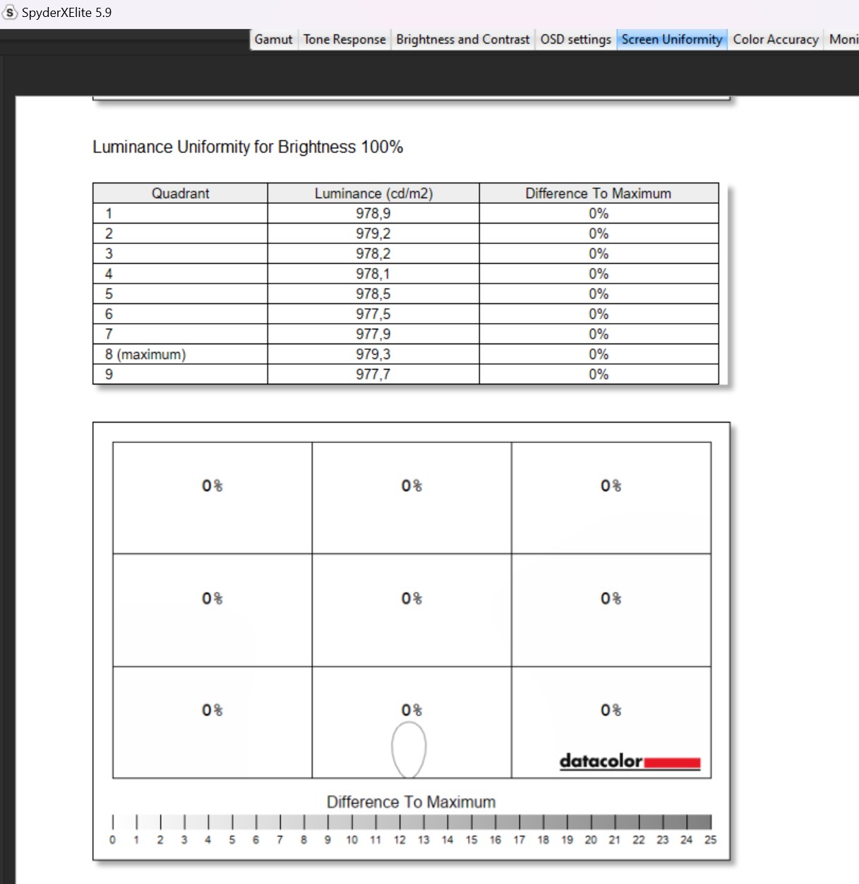 Te wyniki są owocem testu matrycy przed kalibracją w trybie niestandardowym bez jakichkolwiek zmian ustawień i z wyłączoną funkcją Adaptive-Sync. Wynika z nich, że szczytowa jasność sięga aż 979,3 nitów, czyli bardzo blisko zapewnianych przez producenta szczytowych 1000 nitów, które przy 100% jasności są praktycznie identyczne na całym ekranie, a to nie lada osiągnięcie. Im niższa jasność, tym ta jednolitość podświetlenia spada, ale nigdy do niepokojących wartości. Gorzej sprawa ma się ze spójnością kolorów, bo tam wahania są już znaczne na obrzeszach ekranu.