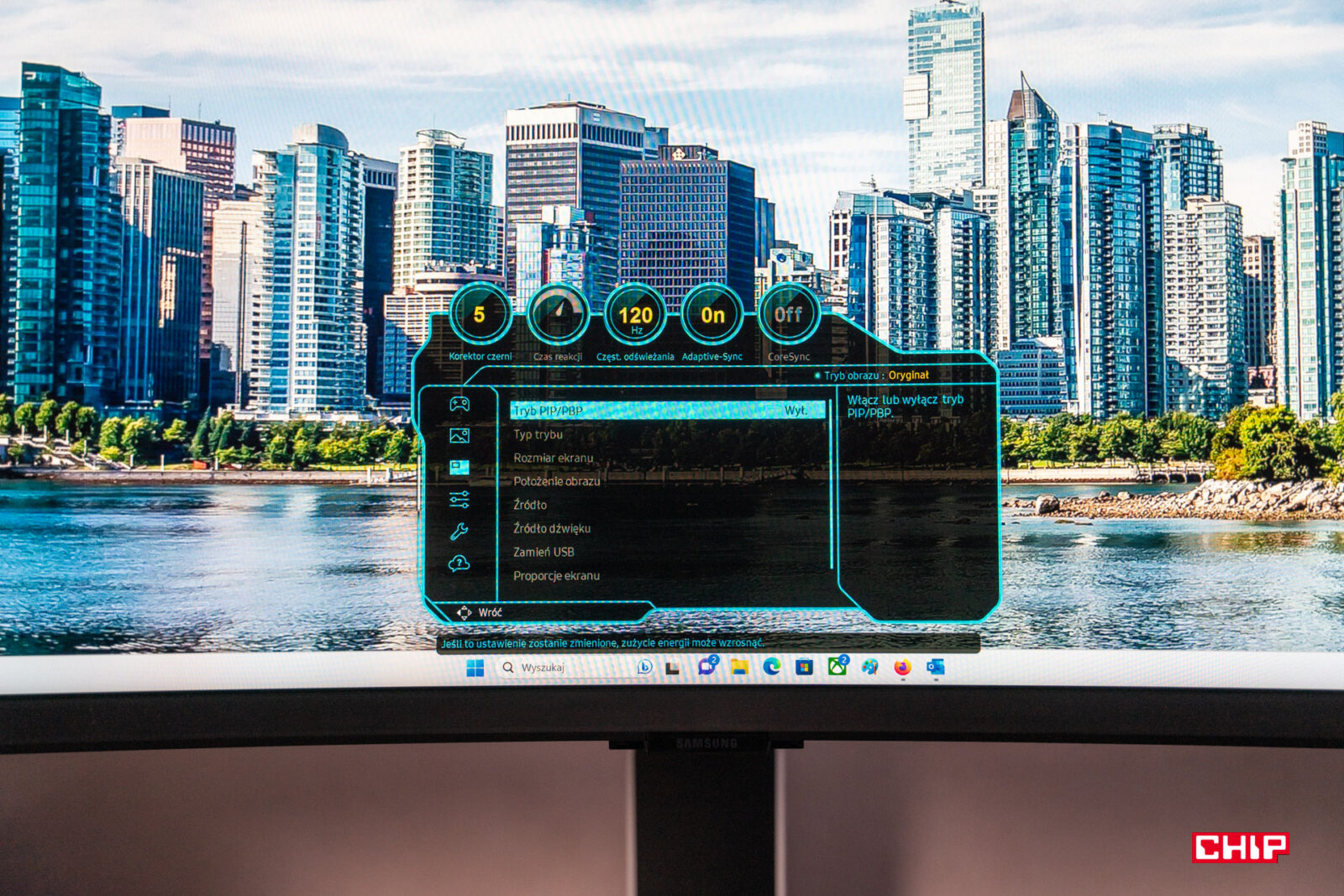 W praktyce możemy więc wpiąć do monitora nawet cztery różne sprzęty, z czego między dwoma z nich (o ile dokupicie drugi przewód USB-B) będziecie mogli przełączać swoje peryferia w ledwie kilka klików. Co to oznacza? Ano to, że osoby potrzebujące dwóch komputerów lub komputera i konsoli do pracy (np. podczas nagrywania gier), mogą wpiąć oba z nich do Odyssey Neo G9 G95NC, aktywować tryb Picture-By-Picture, aby wyświetlać obraz z obu jednocześnie i tak pracować na jednym tylko ekranie i dwóch maszynach. Czy ma to sens? Jeszcze jak, bo ten monitor Samsunga to pierwszy na świecie model, który oferuje rozdzielczość Dual UHD.