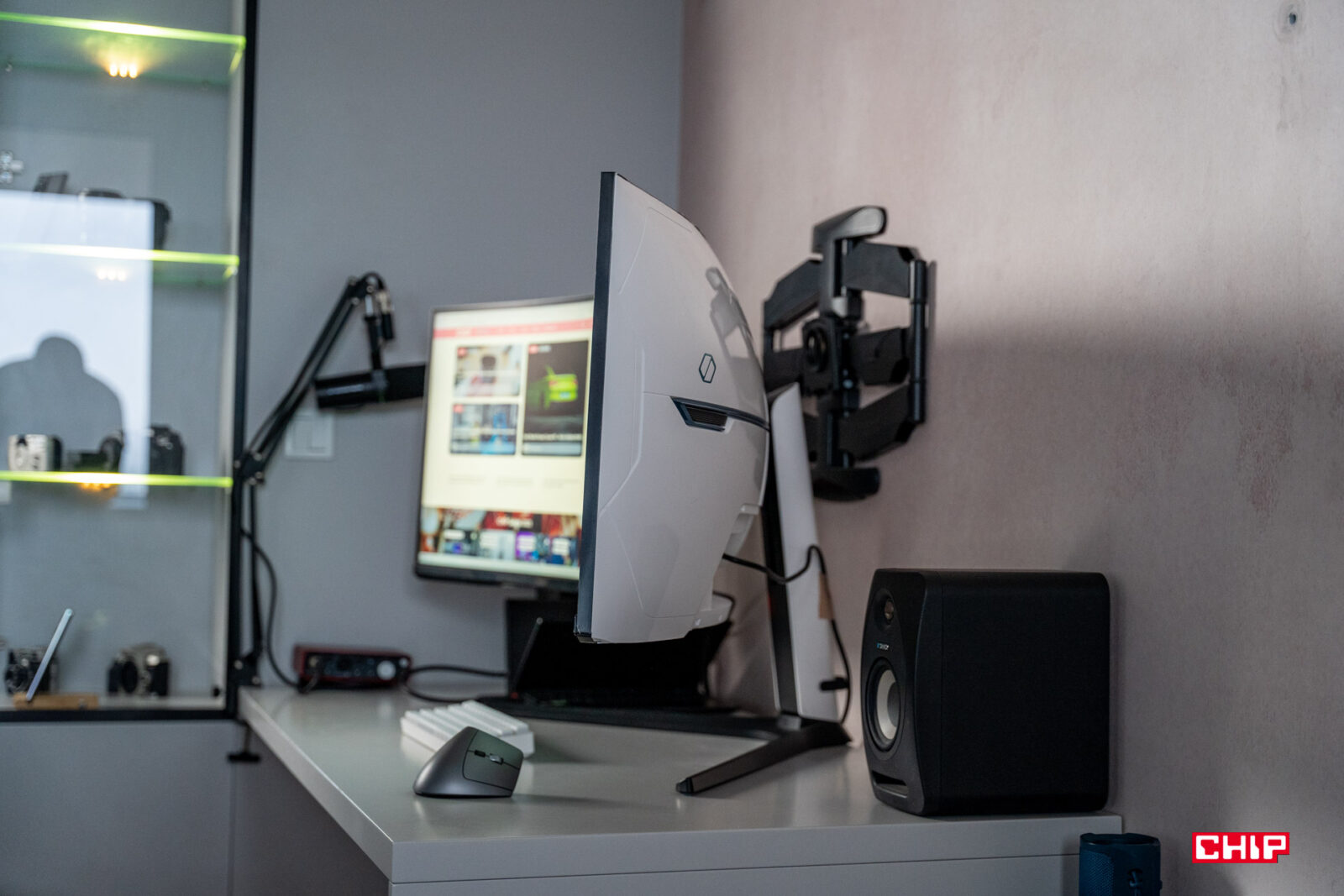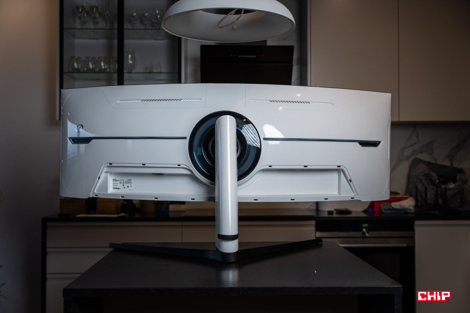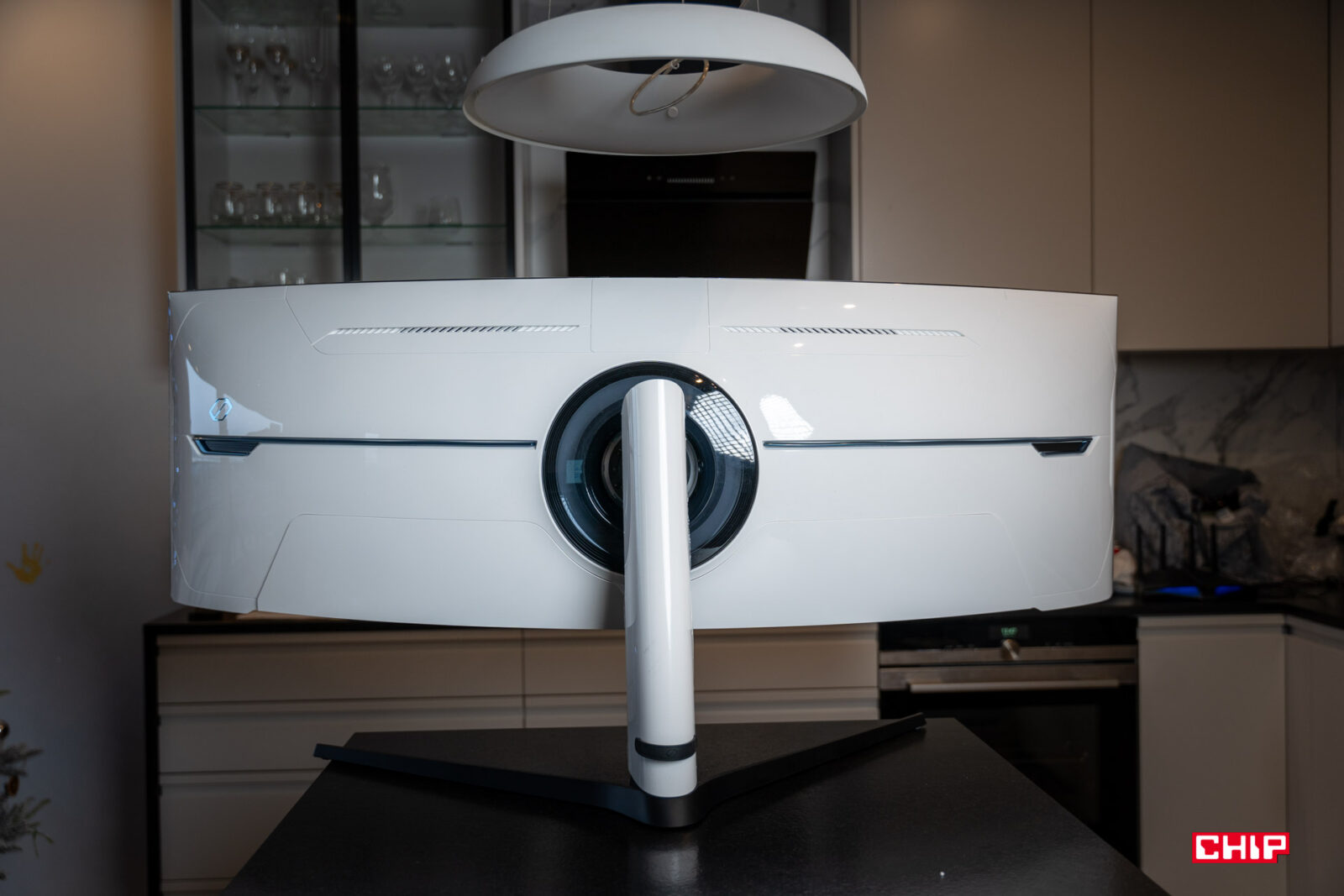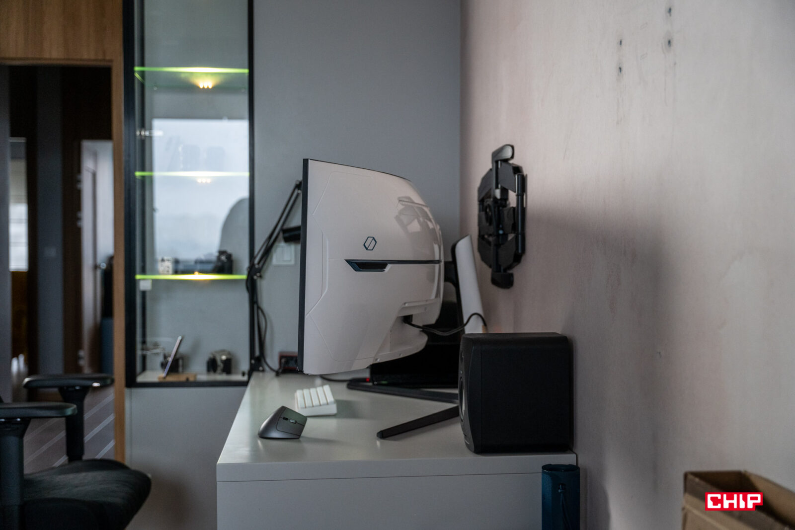 Odyssey Neo G9 G95NC to więc nie lada bestia, jak na 57-calowy monitor o proporcjach 32:9 przystało. Taki kawał sprzętu sam w sobie robi wrażenie, które spotęgujecie wyeksponowaniem solidnej i przyjemnej dla oka obudowy na tyle, która łączy dominującą całość plastikową biel wykończoną na połysk ze srebrnymi wstawkami i licznymi ozdobnikami, przynoszącymi na myśl sznyt science-fiction. Jednak umówmy się – to monitor. Powędruje na miejsce tuż przy ścianie i nigdy nie wyeksponuje swojego tyłu, ale za to podświetli dosyć mały (ale zawsze jakiś) fragment ściany swoim podświetleniem RGB wbudowanym w miejsce montażu ramienia/uchwytu.