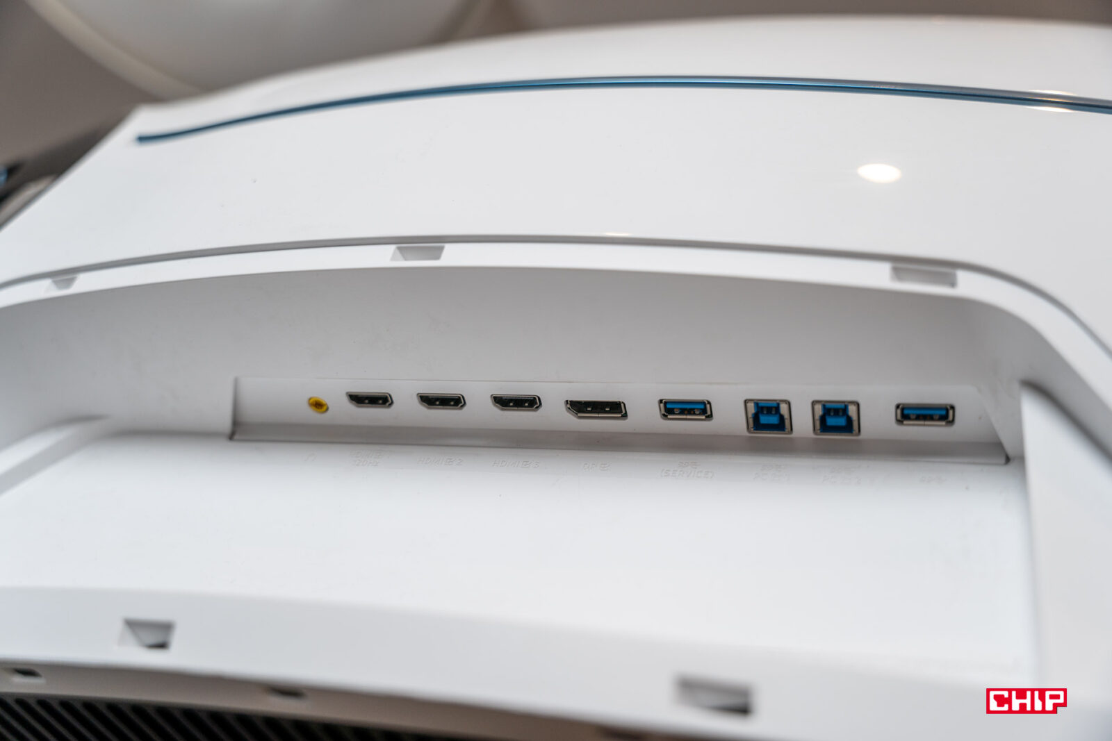 Jednak nawet pomimo natury monitora, Samsung dołączył do zestawu maskownicę na przewody (montuje się ją na zatrzaskach), których może się zrobić naprawdę sporo. Wprawdzie producent zapewnia nam dostęp wyłącznie do czterech (DisplayPort, HDMI, USB-B 3.0 i 1,5-metrowy przewód zasilania), ale zestaw portów na tyle oferuje dostęp do aż:
