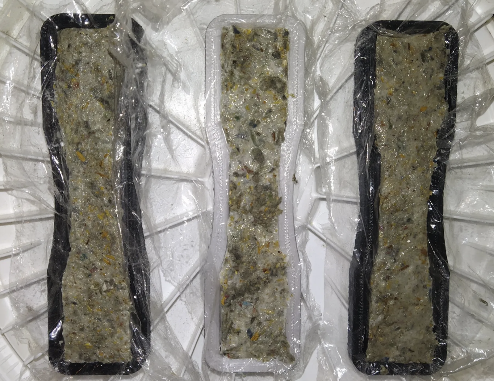Przetestowano różne składy materiałów, aby sprawdzić zachowanie mieszanki o najlepszej proporcji łusek ryżowych. Pierwsza mieszanka składała się z 14 proc. gazet, 9 proc. łusek ryżowych, 15 proc. boraksu i 62 proc. kleju. W pozostałych dwóch kompozycjach zwiększono ilość łusek ryżowych, przy jednoczesnym zmniejszeniu zawartości makulatury. Ilości boraksu i kleju pozostały niezmienione.