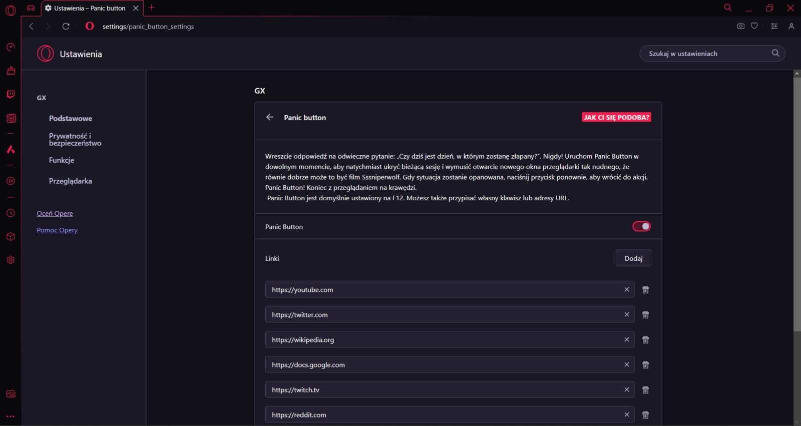 Parametry działania funkcji Panic Button znajdziecie w panelu ustawień przeglądarki Opera GX (sekcja GX). Można w niej przypisać nie tylko własne adresy URL, ale zmienić również zdefiniowany klawisz F12 na inny.