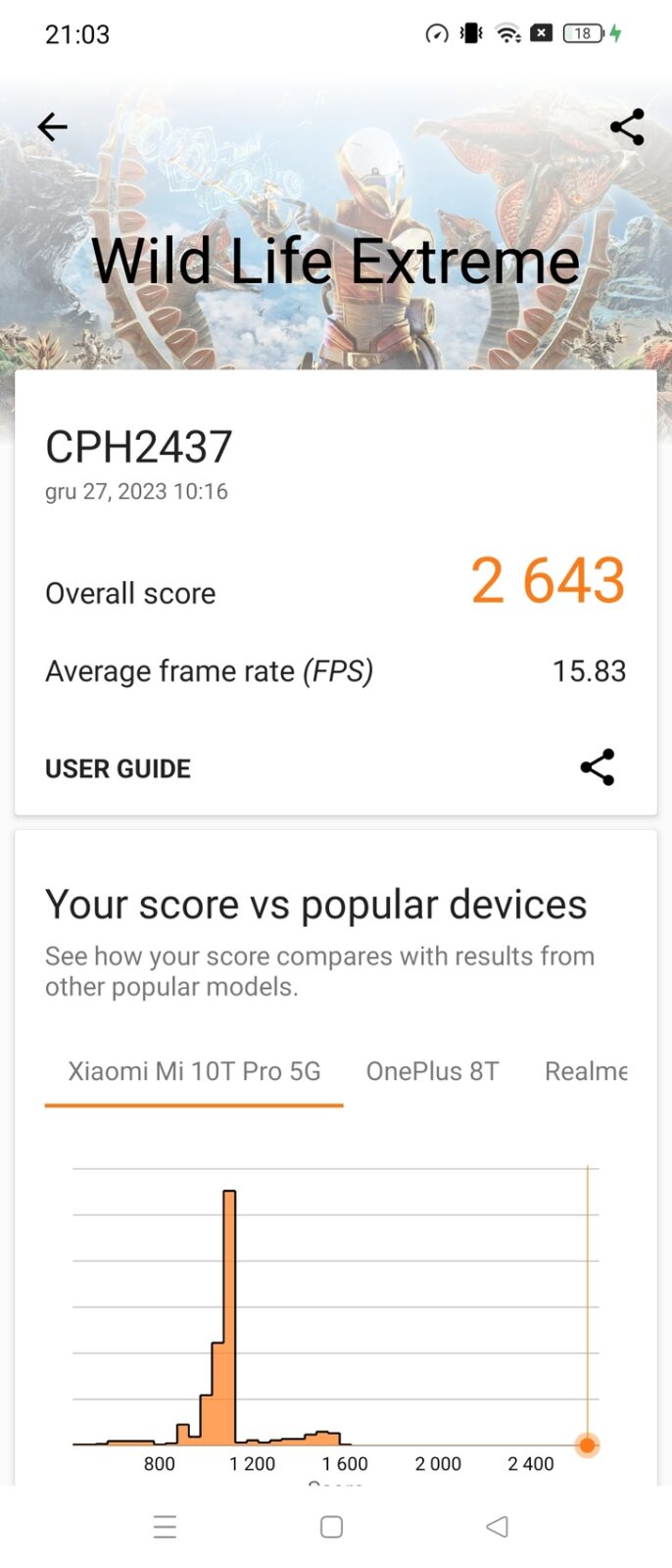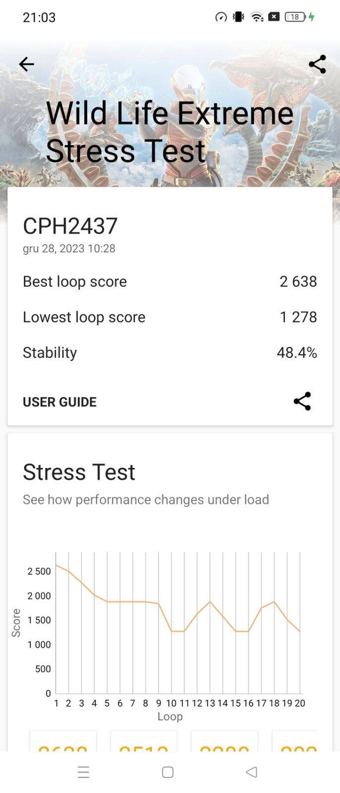 Niestety, podczas pracy z wymagającymi grami i aplikacjami smartfon dość mocno się nagrzewał, także niestety aktualizacja nic nie poprawiła w tym aspekcie. Dość mocno, czyli ile konkretnie? Do 43,5 st w okolicy aparatów – sprawdziłem to termometrem laserowym pod koniec długich stress testów. A skoro przy tym jesteśmy, to wynik osiągnięty w Wild Life Extreme Stress Test na poziomie 48,4% jest podobny do tych, które możemy spotkać w testach na ColorOS 13.