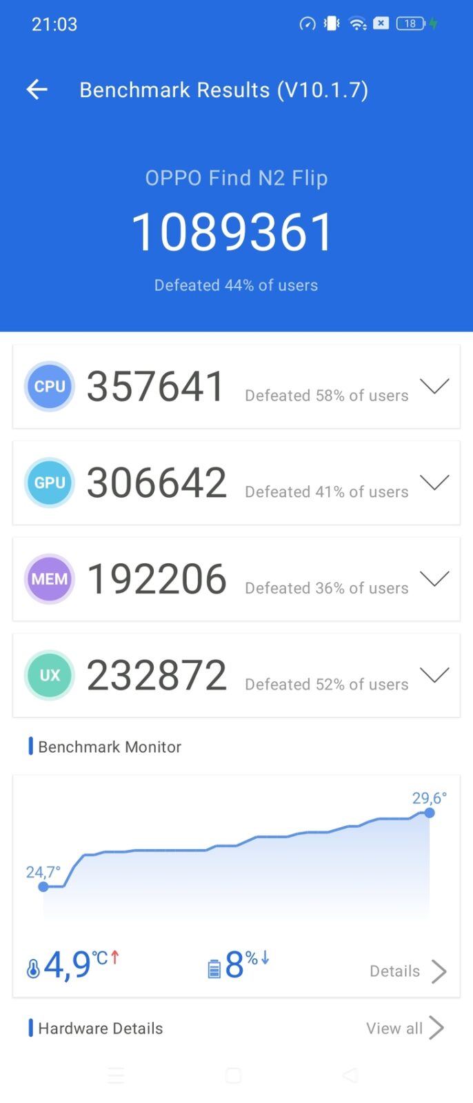 Ciężko powiedzieć, bowiem Oppo Find N2 Flip to flagowy smartfon i to, że ColorOS 14 działał na nim ultra płynnie i stabilnie to nic zaskakującego, zwłaszcza, że podobnie było już na ColorOS 13. To po prostu wynik zgodny z oczekiwaniami. Czy jednak różnica w działaniu będzie wyraźnie odczuwalna na plus w wyraźnie tańszych smartfonach Oppo, tego nie jestem w stanie powiedzieć. Mam nadzieję, że tak.