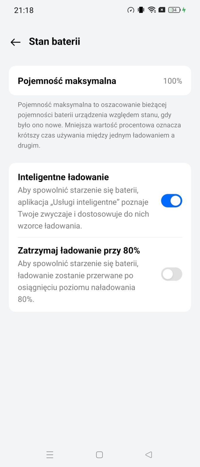 - Smart Charge czyli algorytm, który na podstawie analizy naszego sposobu korzystania ze smartfona dostosowuje moc i czas ładowania w celu spowolnienia procesu starzenia się akumulatora.