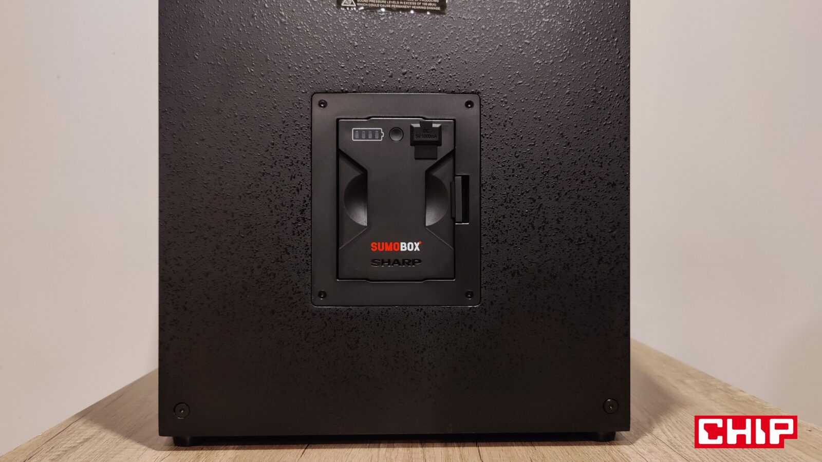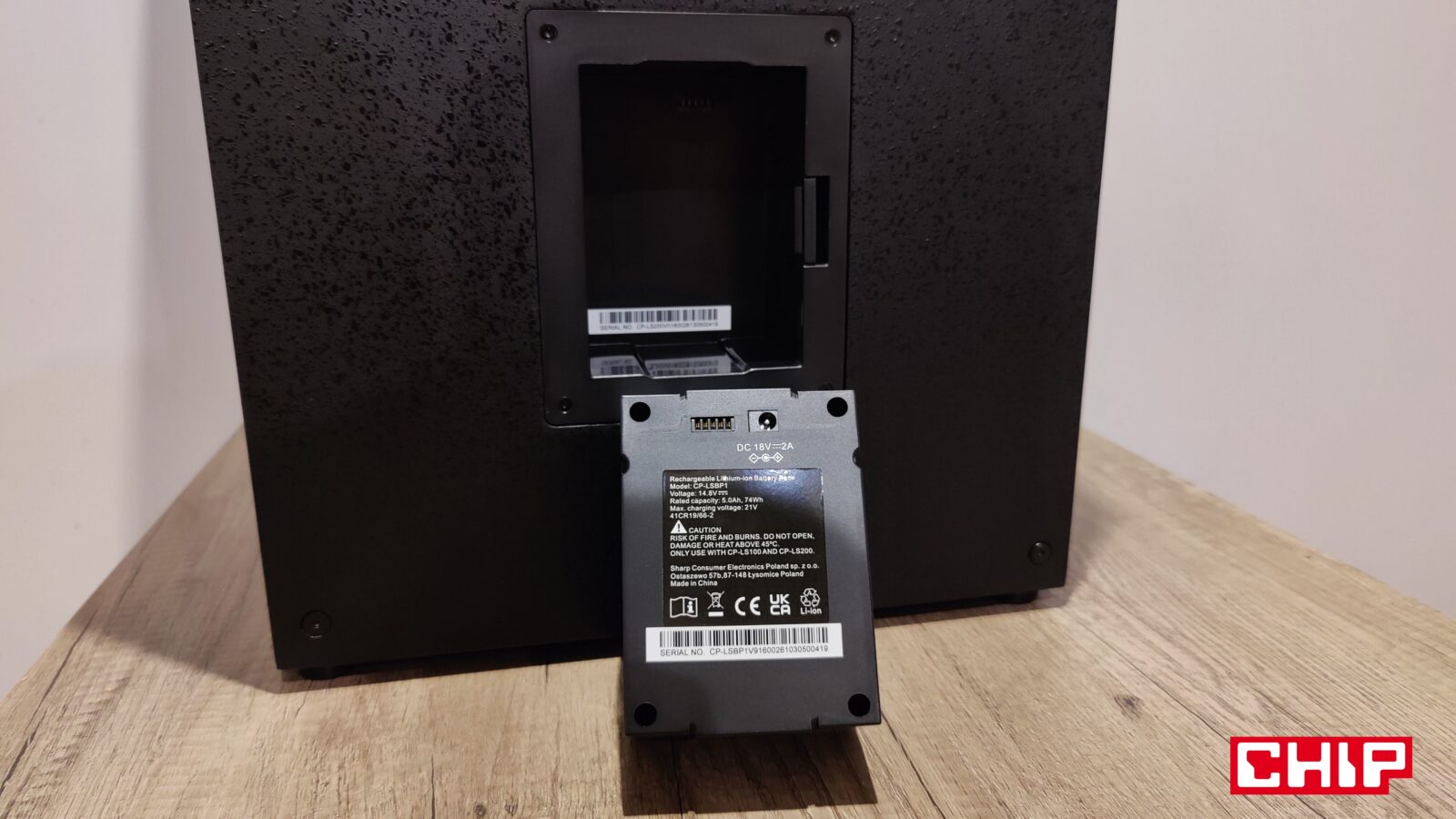 Sharp ma już w swojej rodzinie SumoBox trzy produkty, ale tylko dwa z nich to głośniki, bo tym trzecim jest wymienny 74-Wh akumulator litowo-jonowy przeznaczony zarówno do głośnika CP-LS200, jak i CP-LS100. Jest to stosunkowo prosta konstrukcja w formie 830-gramowego prostopadłościanu, którego wsuwamy do głośnika, a jego “zabezpieczenie” stosowną zastawką realizuje się automatycznie. Tak jak po stronie wewnętrznej akumulator doczekał się łącza zasilającego głośnik, jak i złącza ładowania prądem przemiennym (wymaga stosownej ładowarki), tak z zewnątrz nie można go już niczym podładować, ale spokojnie – wystarczy wpiąć głośnik do zasilania, a akumulator naładuje się wtedy automatycznie.