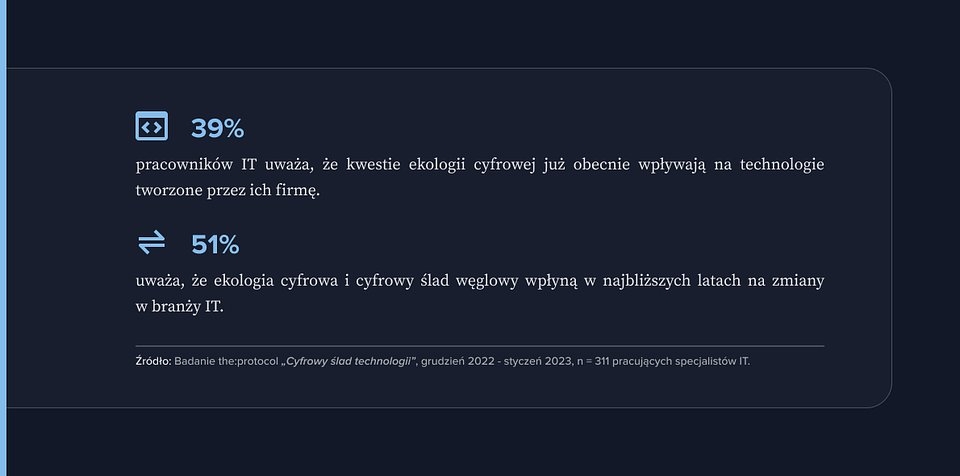 Dobre wieści: ludzie pracujący w obszarze IT wydają się mieć coraz większą wrażliwość na temat ekologii cyfrowej, na co wskazują chociażby wyniki badania the:protocol. Aż 49% ankietowanych uważa, że odpowiedzialność za tę sferę spada właśnie na sektor nowych technologii, bo to w zasadzie on kreuje wzorce korzystania z urządzeń i usług. W grupie świadomych wpływu technologii na ekologię przeważają kobiety pracujące w IT (58%). Aż 6 na 10 pań oczekuje od swojego pracodawcy większego zaangażowania w kwestie przeciwdziałania cyfrowemu śladowi węglowemu. Wśród mężczyzn ten odsetek jest na nieco niższym poziomie (45%). Czy realne zmiany w tej sferze są już widoczne?