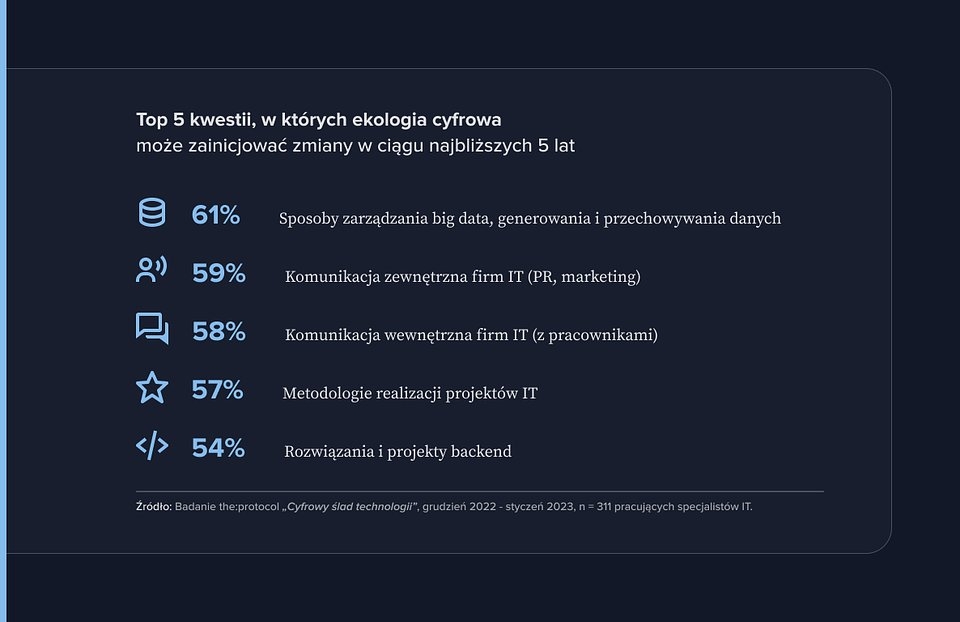 Sposoby zarządzania dużymi zbiorami danych będą mieć niebagatelne znaczenie dla środowiska naturalnego, a według rynkowych prognoz najbliższe pięć lat przyniesie podwojenie liczby generowanych informacji na świecie. Tymczasem nawet połowa z nich jest uważana za słabo wykorzystane i mało istotne. Zjawisko określane jako Dark Data przyczynia się do generowania cyfrowego śladu węglowego i być może dlatego w ostatnim badaniu the:protocol zarządzanie Big Data, w tym generowanie i przechowywanie dużych ilości danych, zostało określone jako główny obszar zmian (61% ankietowanych). Specjalistom IT zależy również na lepszej metodologii zarządzania projektami (57%) oraz programowaniu, które jest bardziej efektywne i mniej energochłonne.