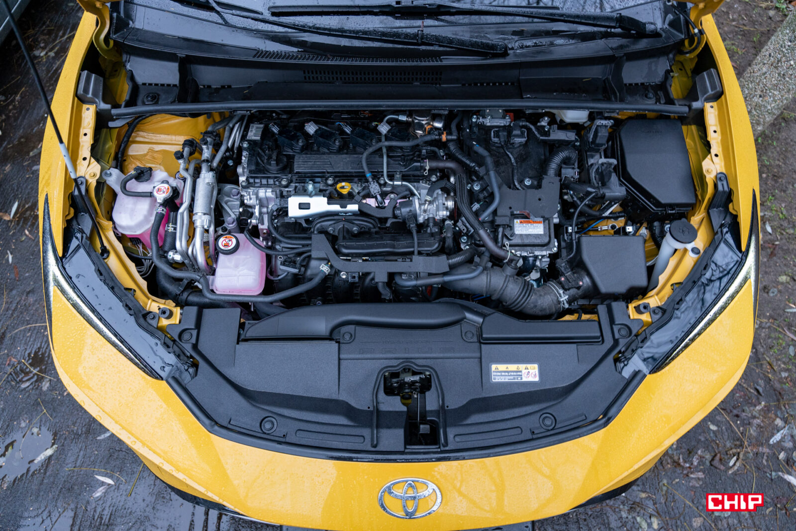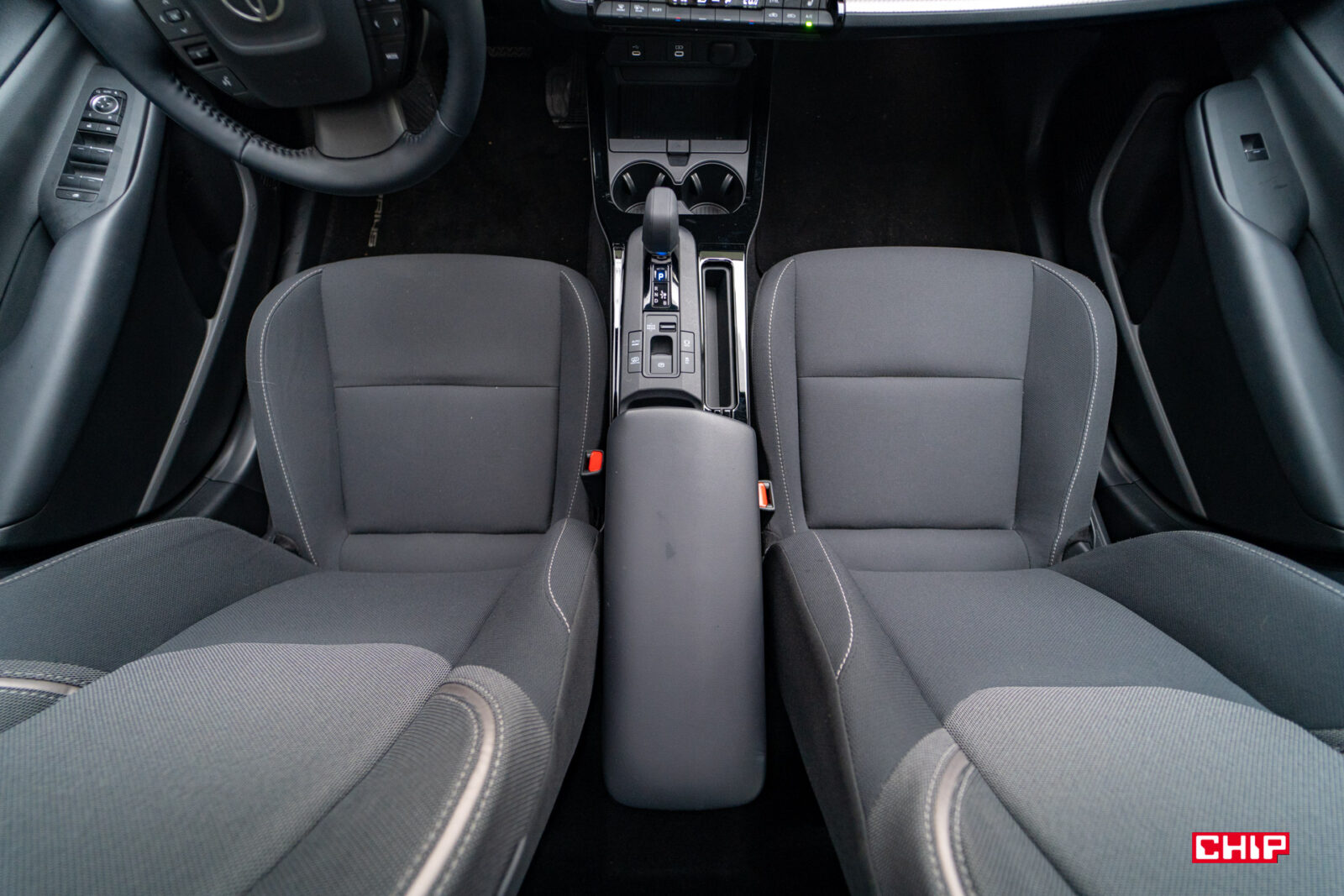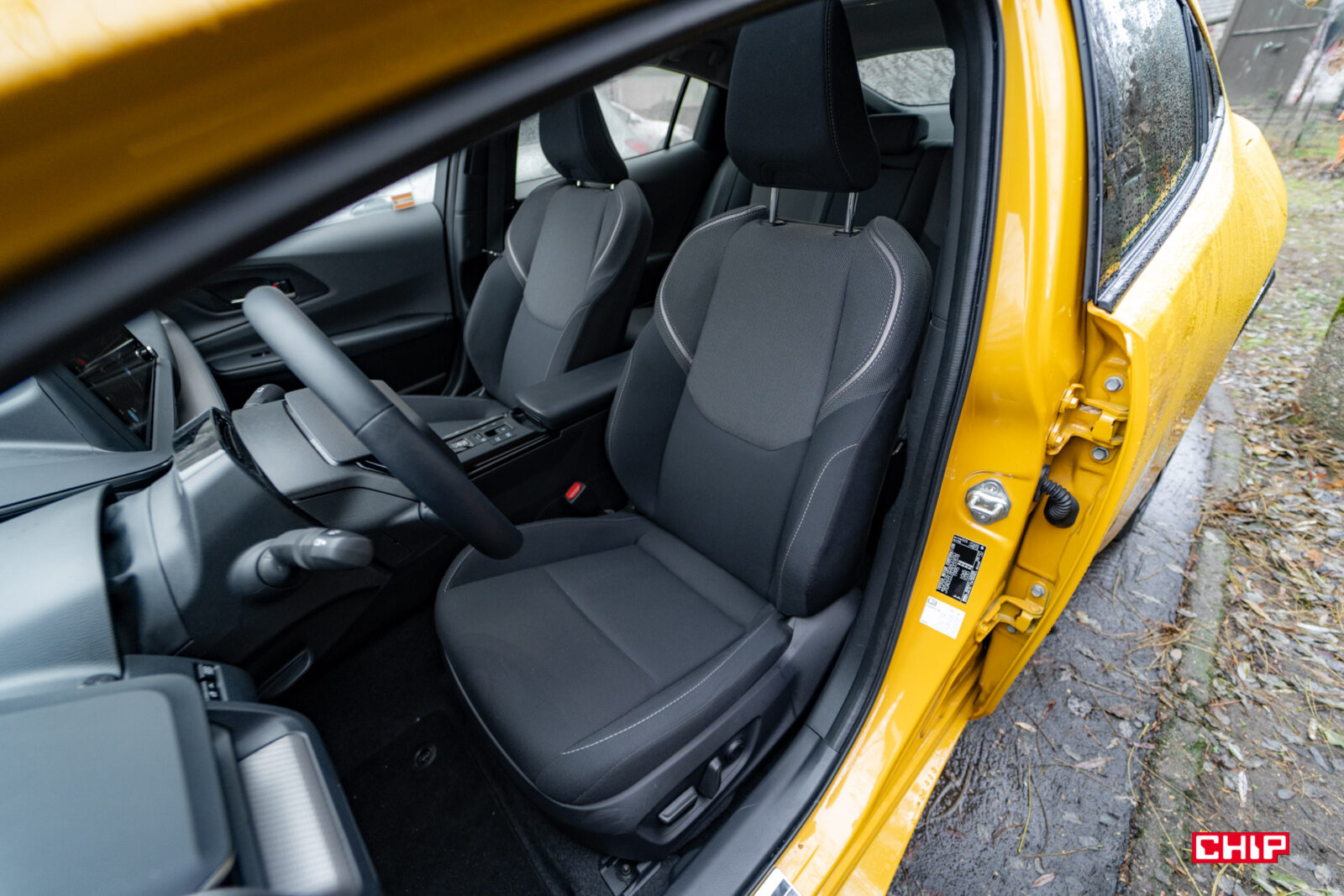 Wnętrze jest dobrze wykonane. Jak na Toyotę może zaskakiwać mała ilość plastików piano black. Jest nowocześnie, choć bardzo funkcjonalnie (tak, patrzymy na fizyczne przyciski pod ekranem). W zależności od wersji wyposażenia dostajemy tapicerkę materiałową lub skórzaną. Jeśli jesteście ciekawi – to nie będzie byle skóra, a skóra wegańska, jednak jest ona zarezerwowana dla najwyższej wersji wyposażenia. Testowany egzemplarz plasuje się w środku stawki, więc mamy tapicerkę materiałową. Fotele są wygodne i dobrze trzymają ciało na zakrętach, do tego są podgrzewane nawet w podstawowej wersji wyposażenia.