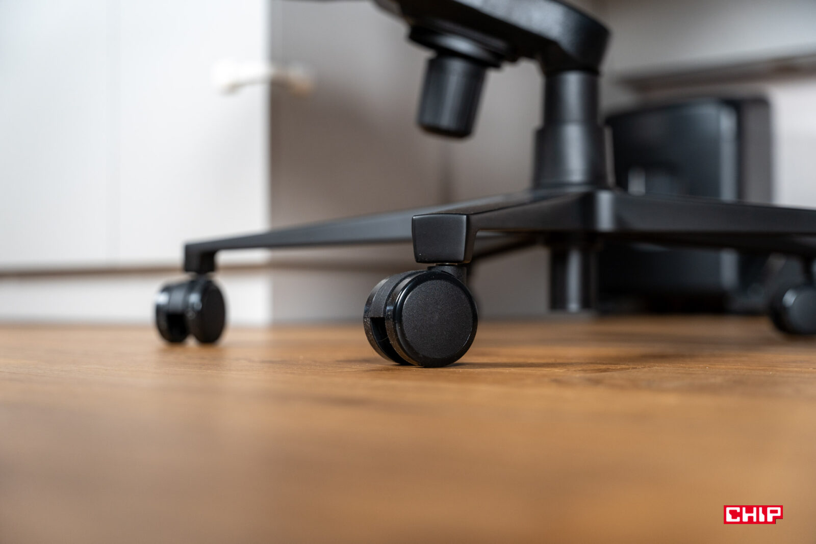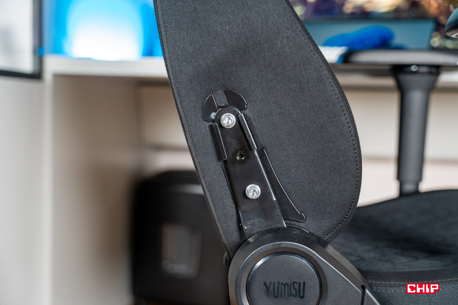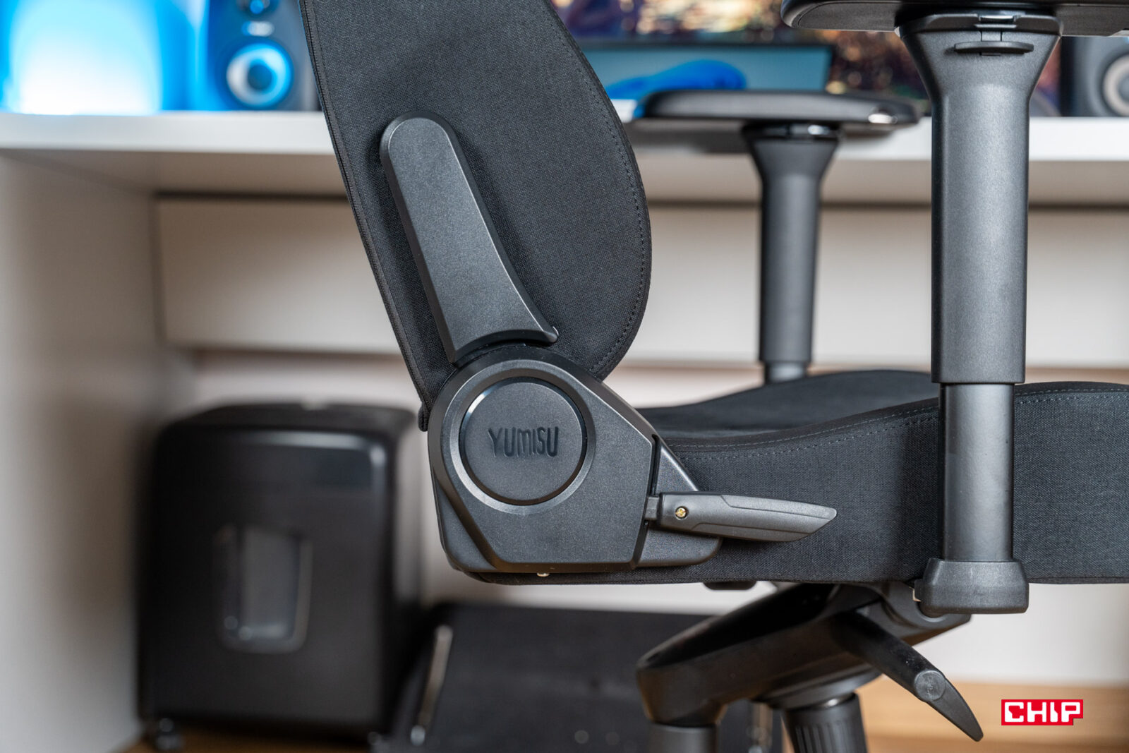 Tym, co wyróżnia Yumisu 2055 jest oparcie. Mamy tu dodatkowy element podpierający odcinek lędźwiowy kręgosłupa. Został ciekawie zaprojektowany, bo jest przymocowany na sprężynie, która porusza się razem z naszymi plecami w dowolnym kierunku. Nazywa się to Harmon Move. Dzięki temu kręgosłup jest przez cały czas podparty. Bardzo nie lubię pompowanych oparć w odcinku lędźwiowym, wszelkiego rodzaju usztywnień i podobnych wynalazków. Bolą mnie od nich… plecy. W przypadku fotela Yumisu nie odczuwałem żadnego dyskomfortu, więc to faktycznie się sprawdza.