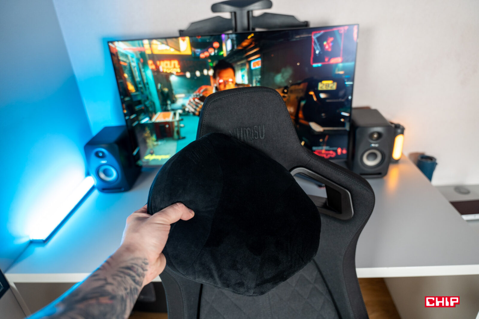 Po złożeniu fotela i tutaj też polecam zajrzeć do wideo, został mi ostatni element – poduszka pod głowę. Szybko stwierdziłem, że dostałem niekompletny zestaw. Instrukcja jasno mówi, że trzeba ją zamontować za pomocą pasów. A tu ani pasów, ani otworów w poduszce. Zagadka szybko się rozwiązała, bo poduszka jest… magnetyczna. No tak, Magnetic! Wystarczy przyłożyć ją do oparcia i już się trzyma. A trzyma się bardzo solidnie i ani razu nie spadła mi w trakcie użytkowania.