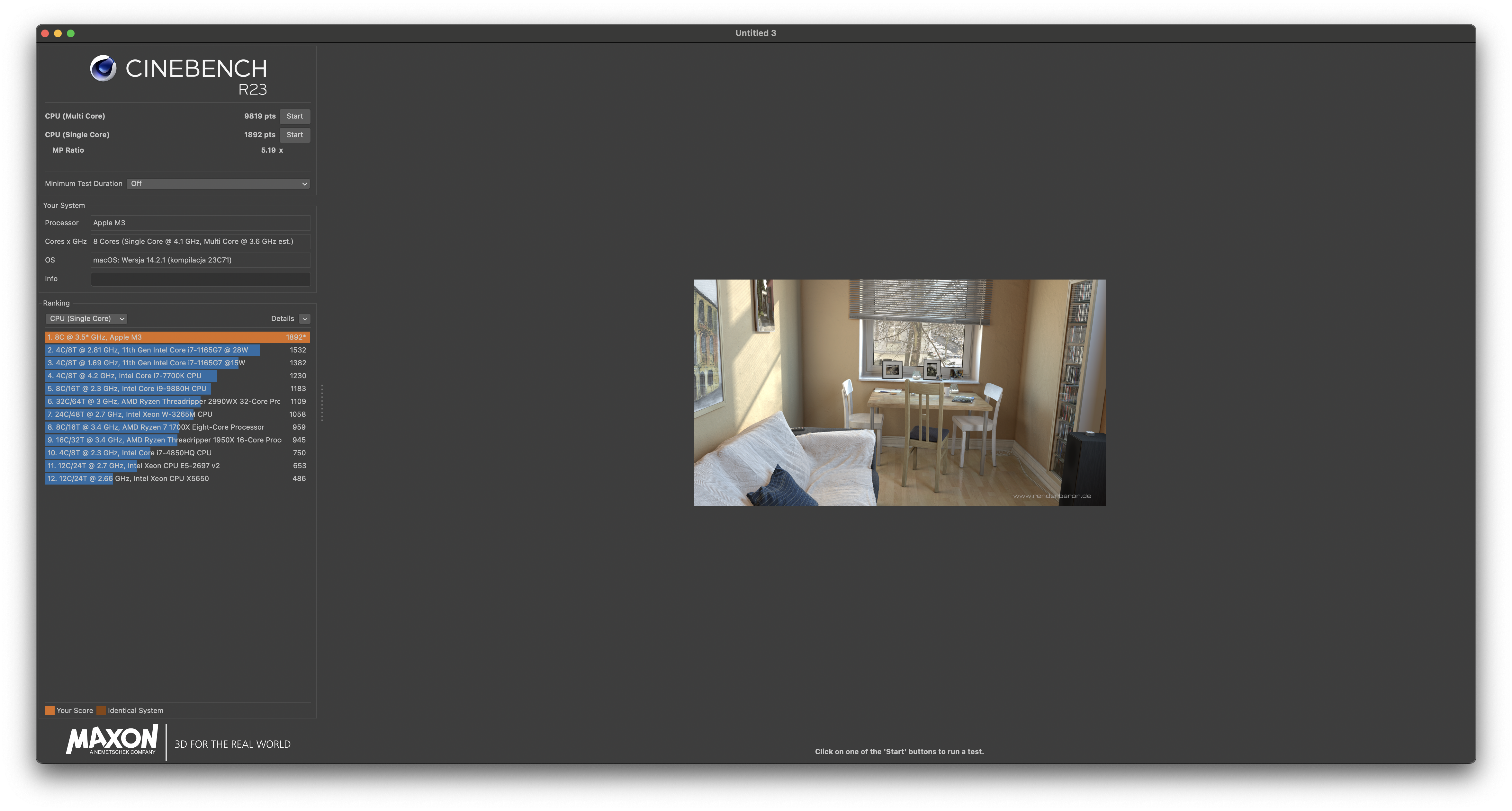 - Cinebench R23: 9819 pkt CPU Multi Core / 1892 CPU Single Core / MP Ratio x5,19