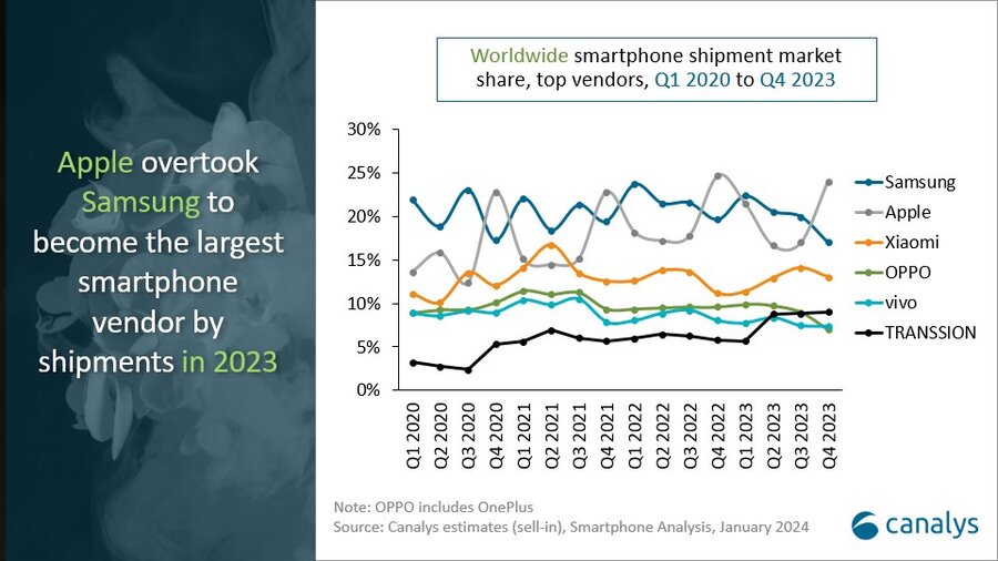 Jak zauważają analitycy Canalys, w skali globalnej dostawy smartfonów w okresie Q4 2023 wzrosły o 8% rok do roku, osiągając poziom 320 milionów egzemplarzy, kładąc jednocześnie kres spadkom utrzymującym się przez ostatnie siedem kwartałów. Duży popyt na iPhone’a 15 spowodował, że Apple wysunęło się na pozycję lidera rynku z udziałem wynoszącym 24%. Drugą pozycję zajął Samsung z udziałem 17%, tracąc w stosunku do 2022 roku głównie w segmencie niskobudżetowym. Xiaomi znalazło się na trzecim miejscu (13%), podczas gdy Transsion (właściciel marek Infinix i Tecno) zakończył 2023 roku jako czwarty wiodący producent smartfonów (9%). Pierwszą piątkę zamyka Vivo z udziałem 7%.