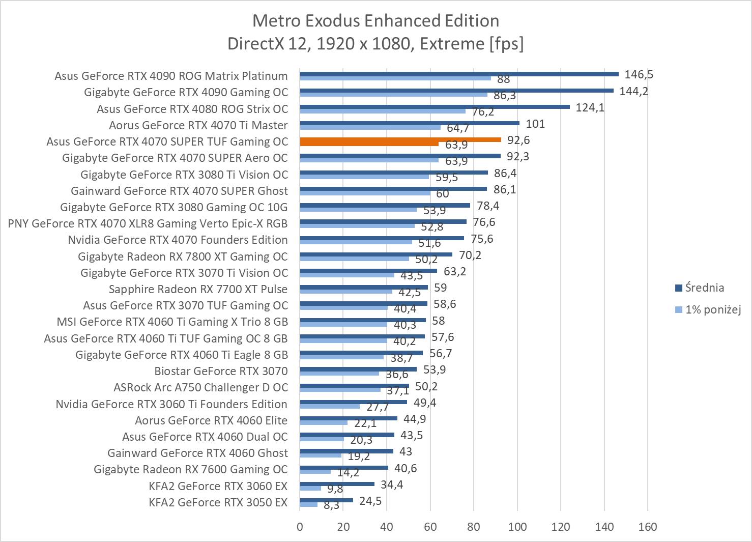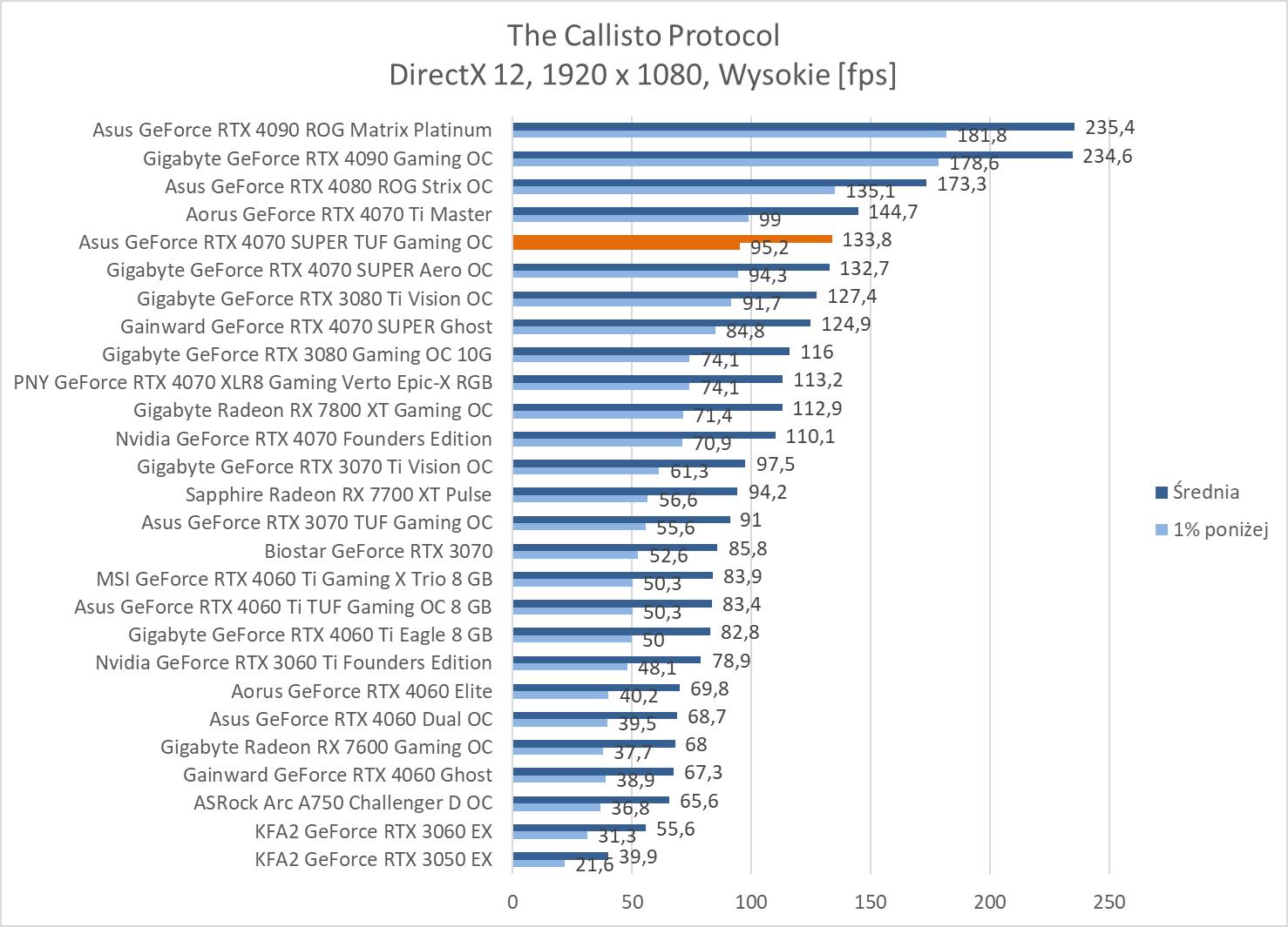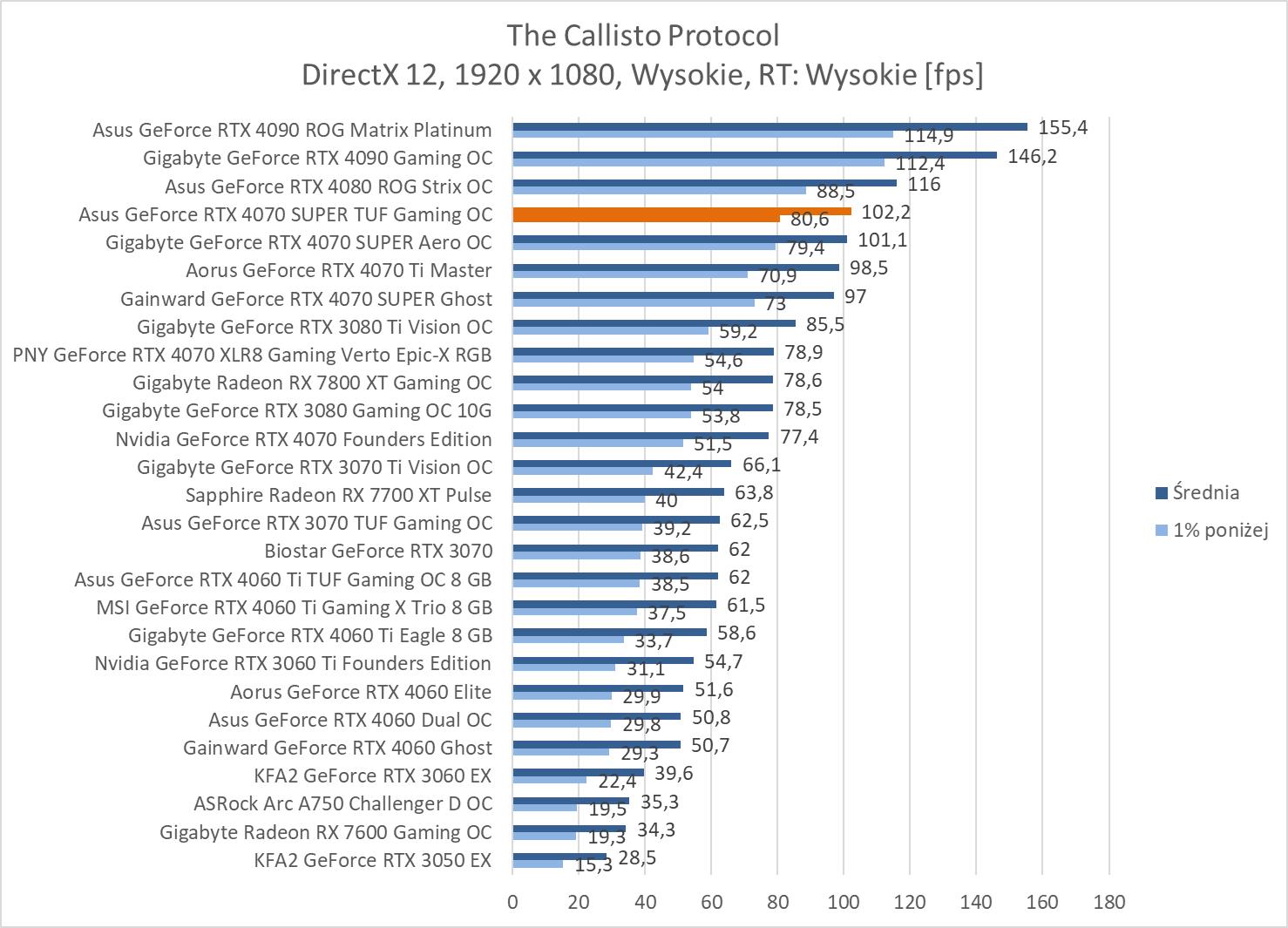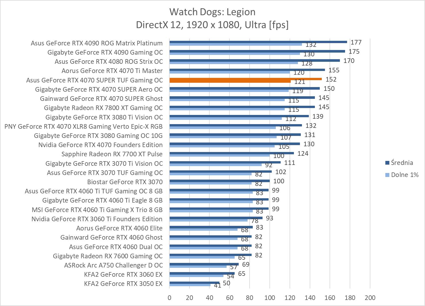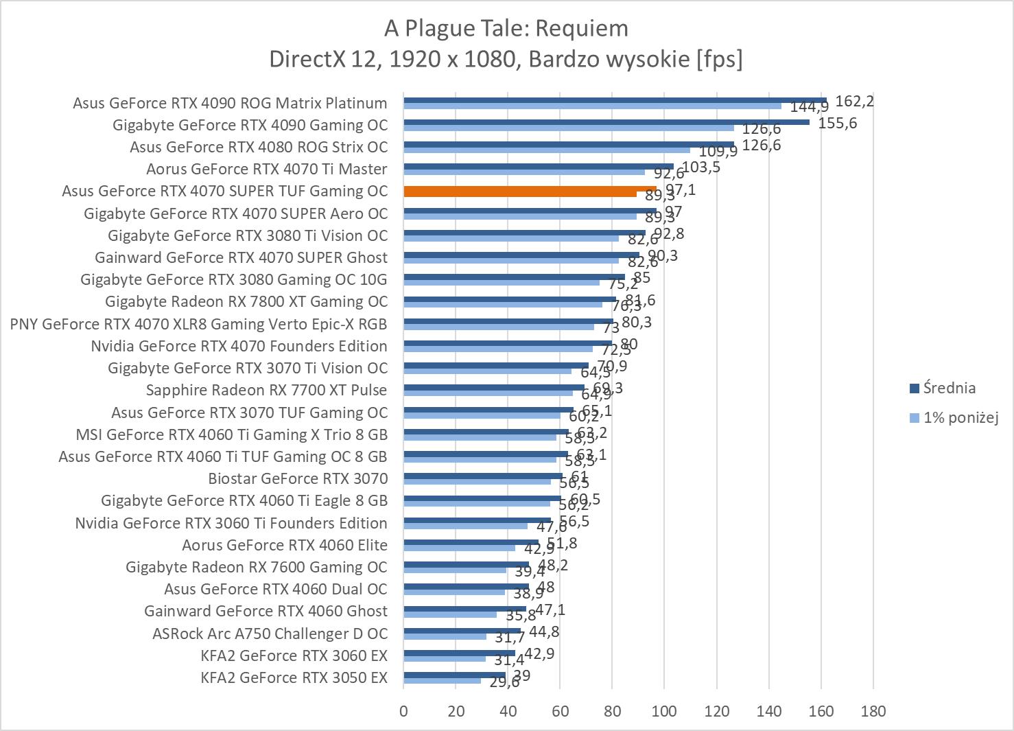 W 1920 x 1080 możecie bez problemów odpalać gry na maksymalnych detalach. Asus GeForce RTX 4070 SUPER TUF Gaming OC wypada świetnie i bez problemów zapewnia w pełni płynną rozgrywkę.
