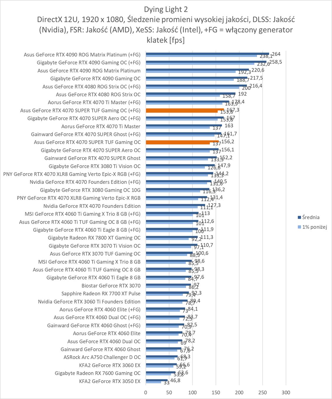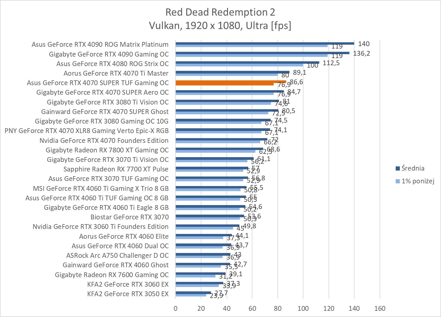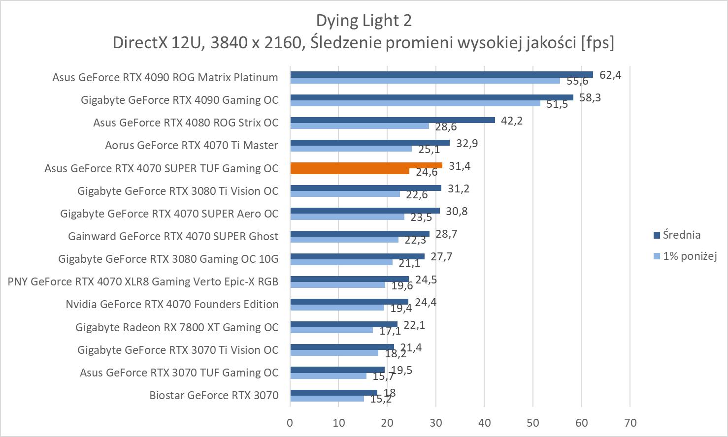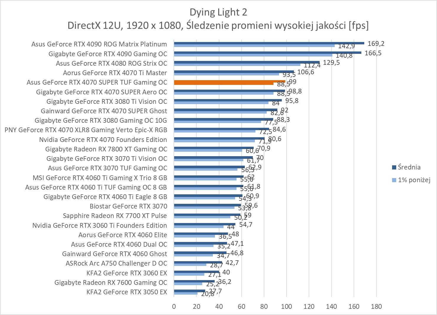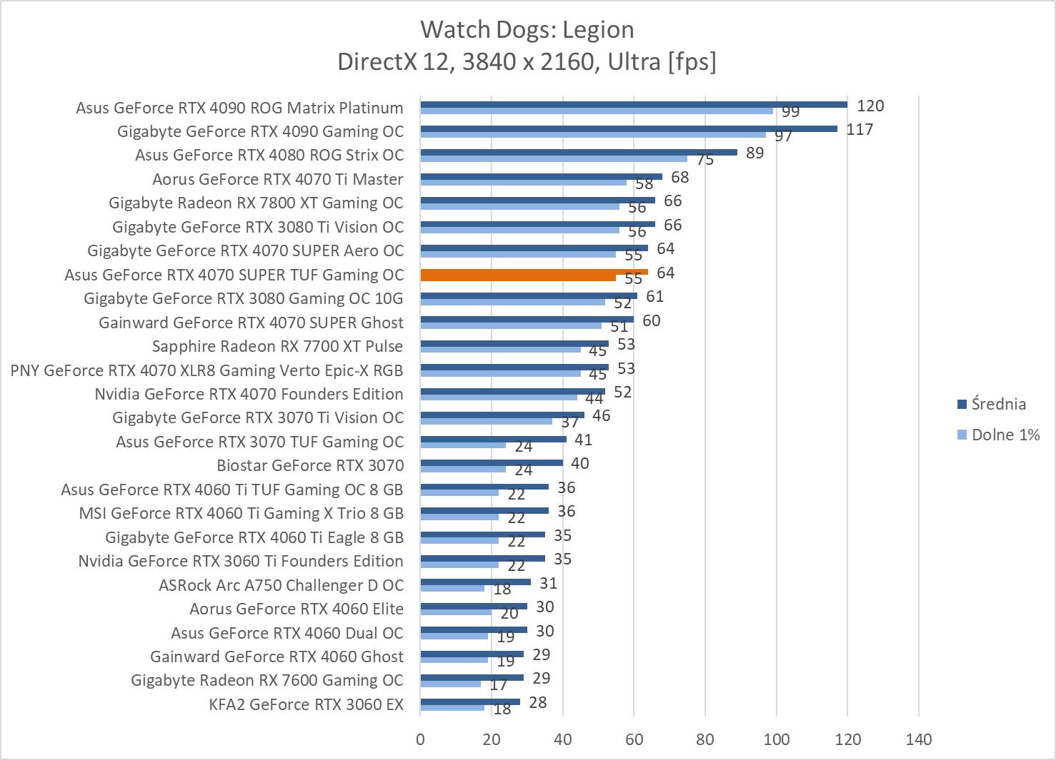 Grafika ma fabryczne OC, co widać po wynikach testów – jest to jak do tej pory najwydajniejszy model RTX 4070 SUPER, mający widoczną przewagę nad niepodkręconą wersją. Wyniki są bardzo dobre i jest jej bliżej do RTX 4070 Ti niż do RTX 4070. Bez problemów pokonuje ona 7800 XT (choć tą kartę kupicie już a ok. 2400 zł) i tutaj nawet nie ma co się zastanawiać nad wyborem modelu. W grach z ray tracingiem różnice są jeszcze większe. Asus GeForce RTX 4070 SUPER TUF Gaming OC bardzo dobrze sprawdzi się w grach w rozdzielczości 2560 x 1440 px, gdzie zapewni naprawdę dobrą wydajność, a w bardziej wymagających tytułach z ray tracingiem DLSS pozwoli na uzyskanie powyżej 60 fps. To właśnie DLSS 3 jest też jedną z większych zalet testowanego modelu – znajdziecie tą technologię w naprawdę sporej ilości tytułów.