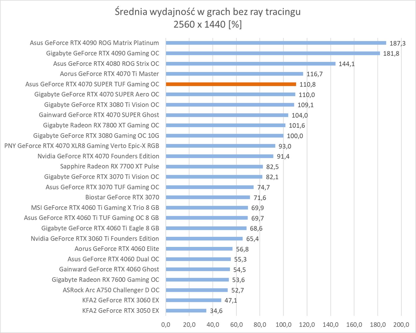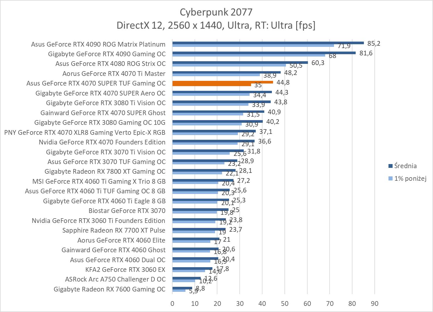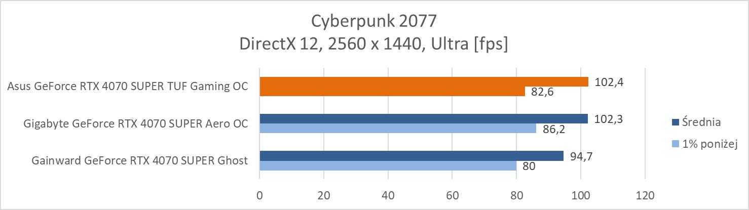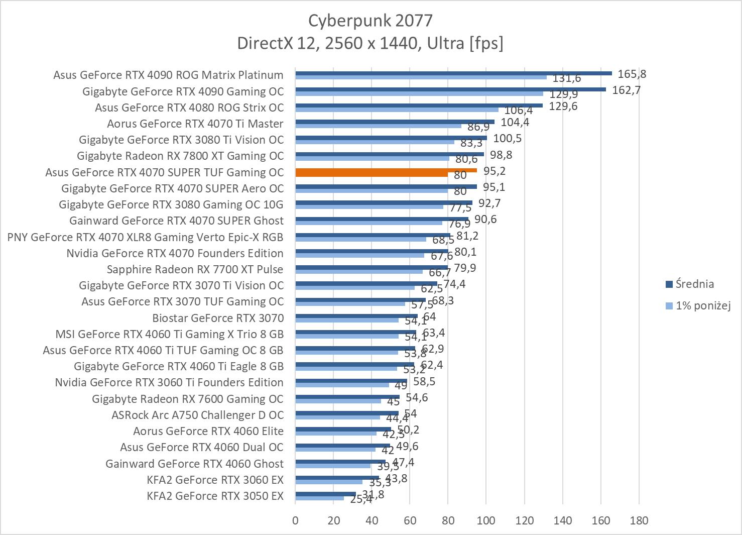 W 2560 x 1440 wszystko zależy od gry. Karta Asus GeForce RTX 4070 SUPER TUF Gaming OC zapewnia ponad 60 fps w mniej wymagających grach, ale w Hogwarts Legacy czy Cyberpunk 2077 wyniki są już niższe.